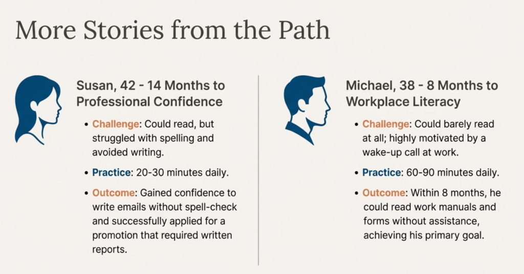 Susan, age 42, could read but struggled with spelling and avoided writing. She practiced 20-30 minutes daily while managing a household and part-time job.
