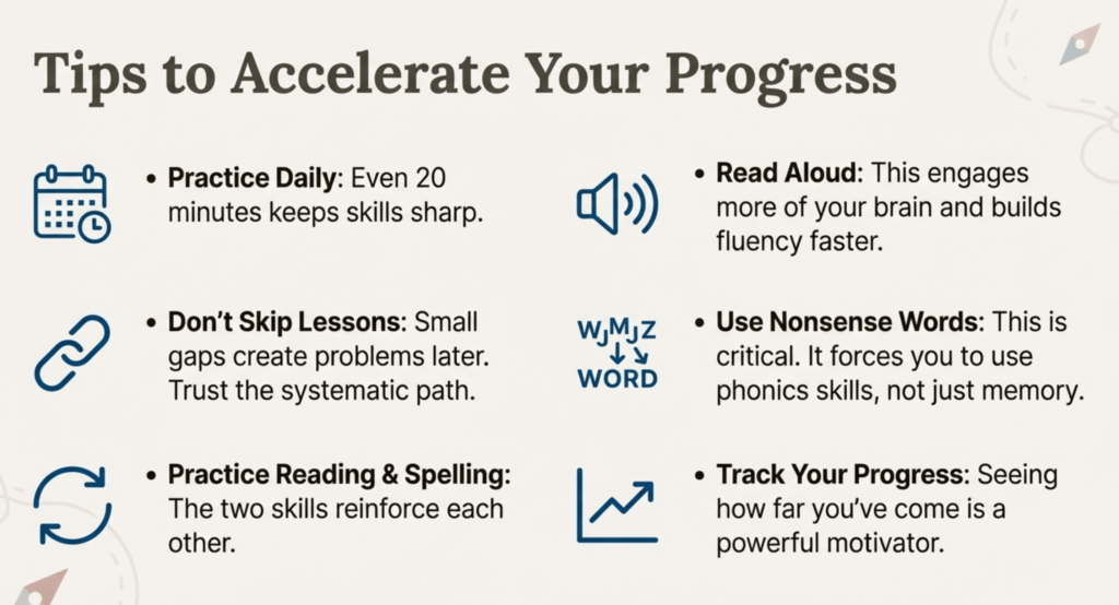 Don’t skip nonsense word practice. These made-up words force you to use phonics skills rather than memory—crucial for true mastery.