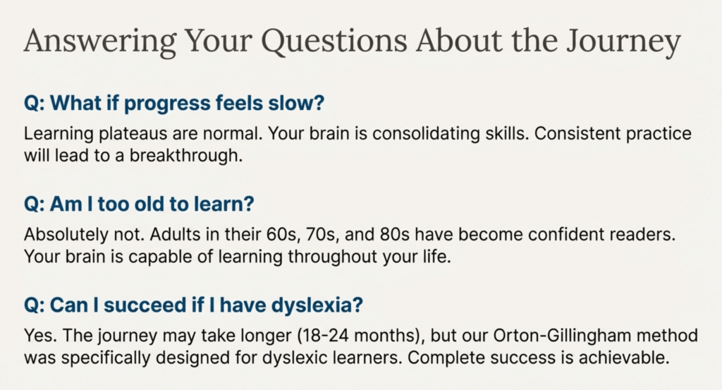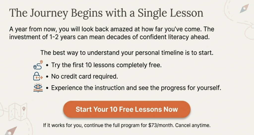 The investment of time is significant, but consider this: you’ll likely live another 20, 30, 40, or more years. Spending 1-2 years to master reading means decades of confident literacy ahead.