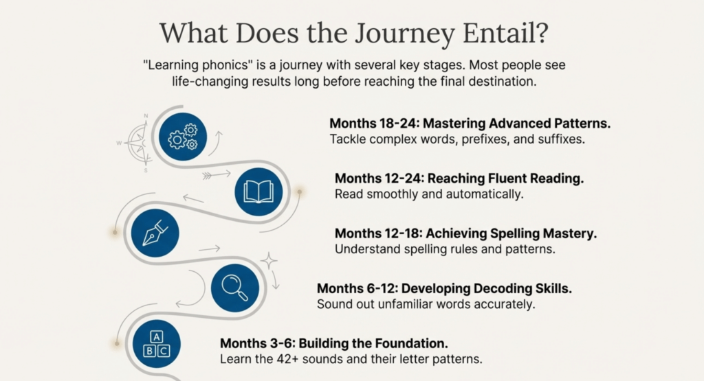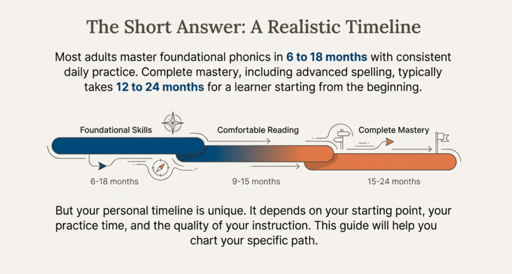 Most adults can master foundational phonics skills in 6 to 18 months with consistent daily practice. Complete mastery of all English phonics patterns—including advanced spelling rules and multisyllabic word decoding—typically takes 12 to 24 months for adult learners starting from the beginning. However, your personal timeline depends on several factors: your current reading level, how much time you can dedicate to practice, whether you have learning differences like dyslexia, and the quality of instruction you’re receiving.