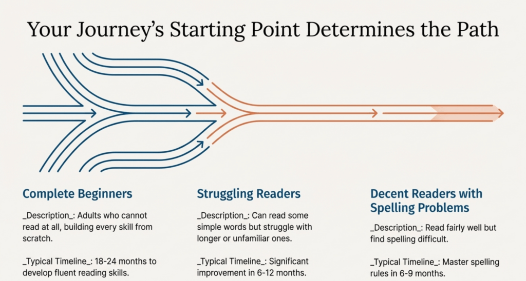 Complete beginners (adults who cannot read at all) typically need the full 18-24 months to develop fluent reading skills. They’re building every skill from scratch.