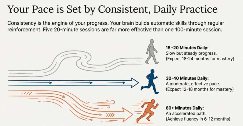 - 15-20 minutes daily: Slow but steady progress; expect 18-24 months for complete mastery