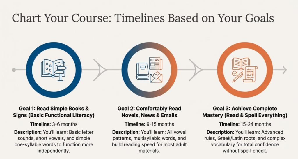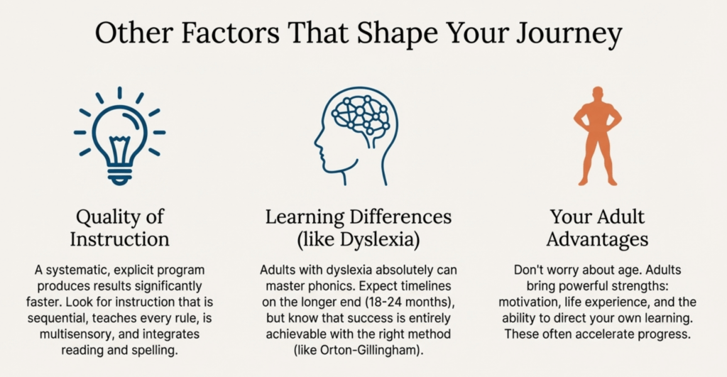 Adults with dyslexia or other learning differences often need more time and repetition but absolutely can master phonics with proper instruction. Expect timelines on the longer end (18-24 months) but know that success is entirely achievable. Learn more about how dyslexic adults can learn to read with realistic expectations and success stories.