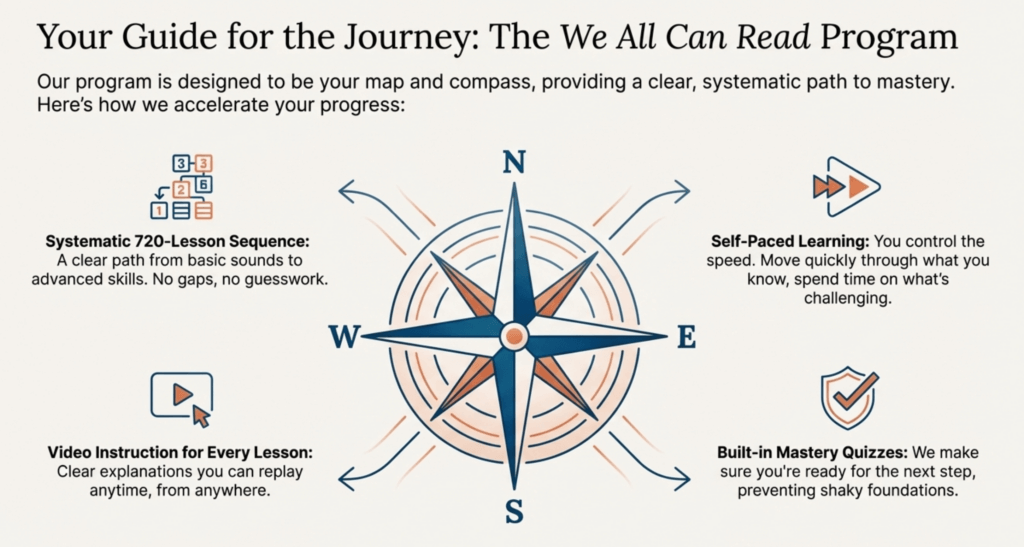 Our adult phonics program is specifically designed to help you progress as quickly as possible while ensuring true mastery at every step: