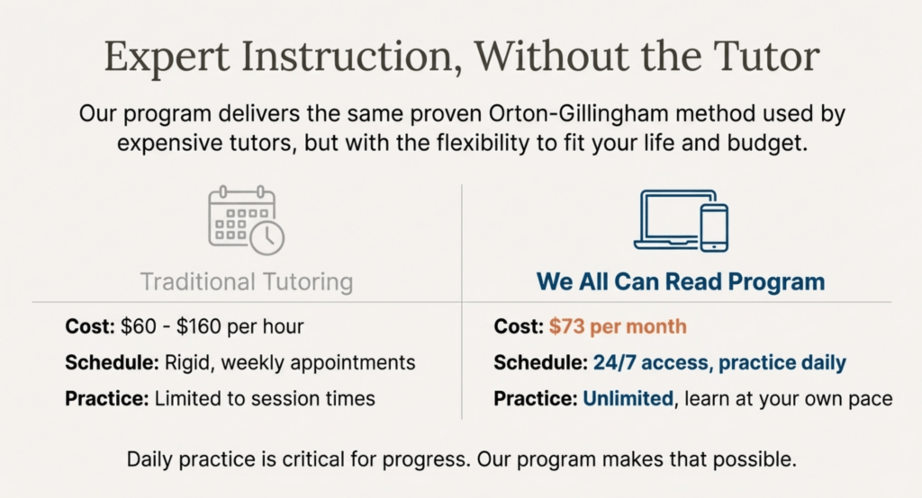 Traditional Orton-Gillingham instruction requires expensive tutoring ($60-$160 per hour). Our program delivers the same systematic approach through video lessons you can access 24/7 for just $73/month.