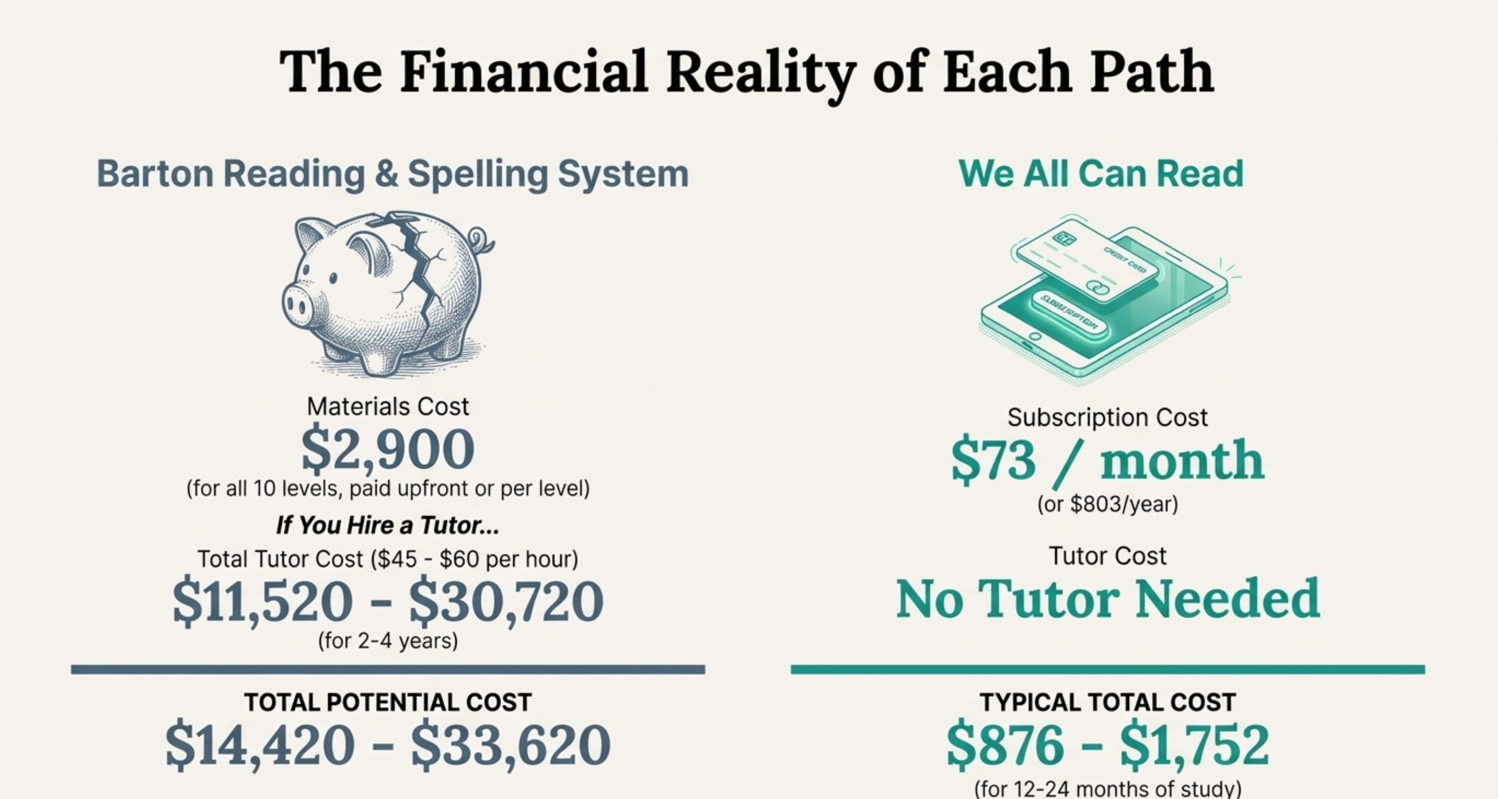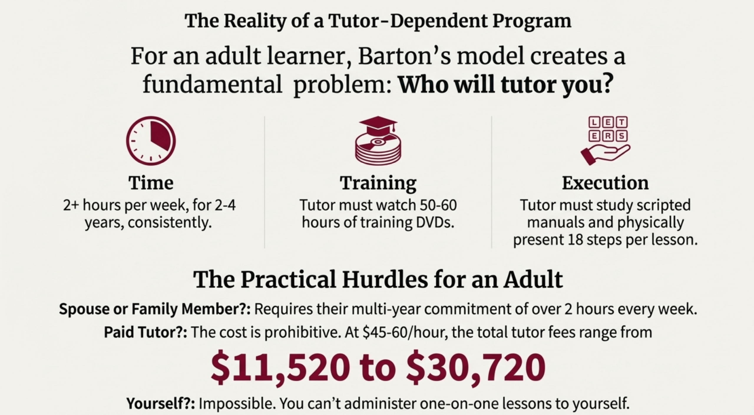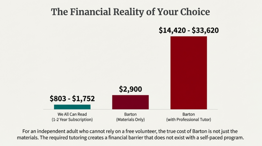The reality: Most adults don’t have someone willing or able to commit 2+ hours per week for 2-4 years to tutor them. And hiring a professional Barton tutor costs more than most adult literacy students can afford.