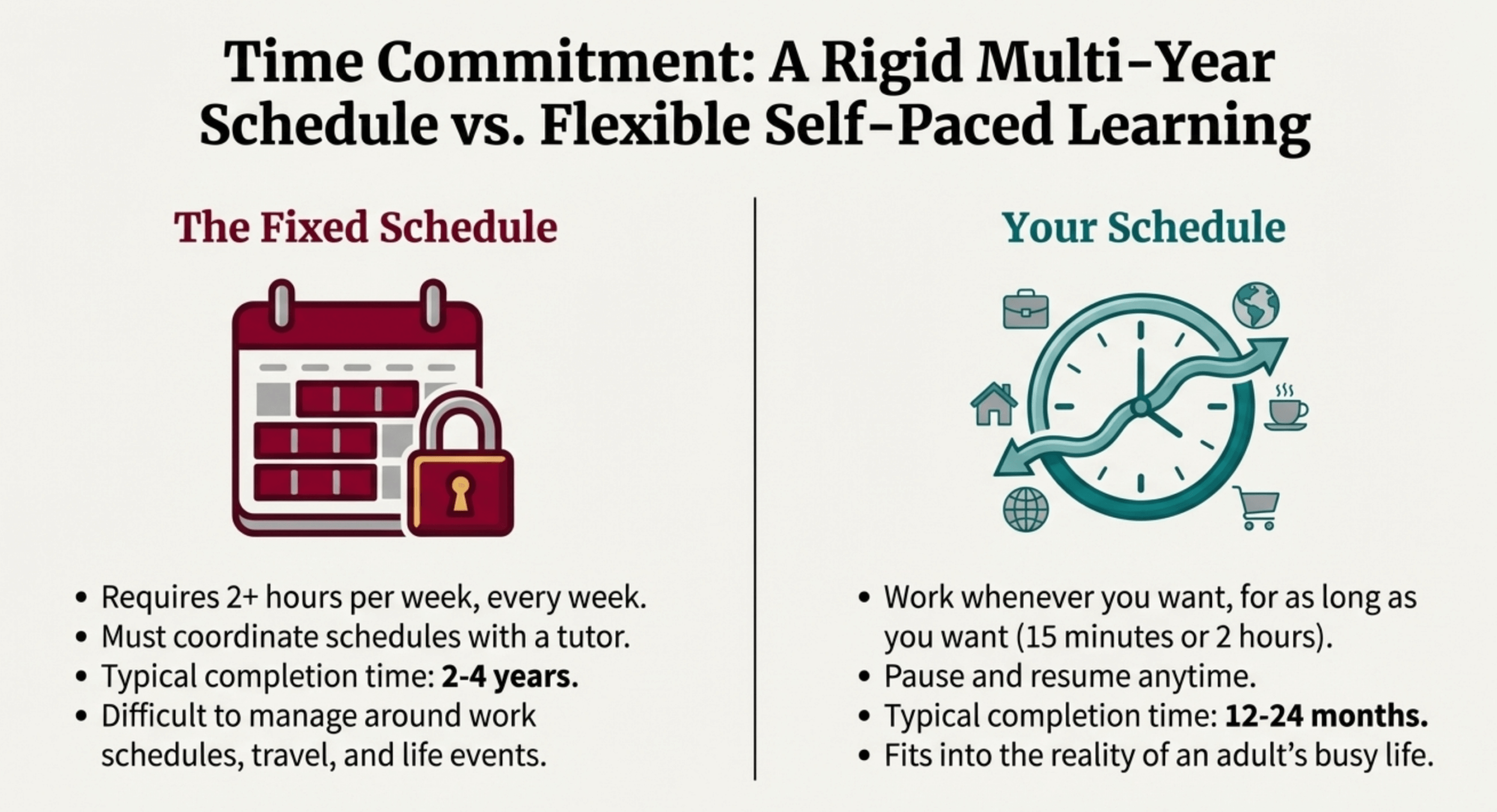 | Time Commitment | 2 hours/week + tutor time (2-4 years) | Self-paced, work on your schedule (12-24 months typical) |