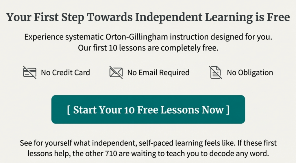 Experience systematic Orton-Gillingham instruction designed specifically for independent adult learners. Our first 10 lessons are completely free—no credit card, no email, no obligation.