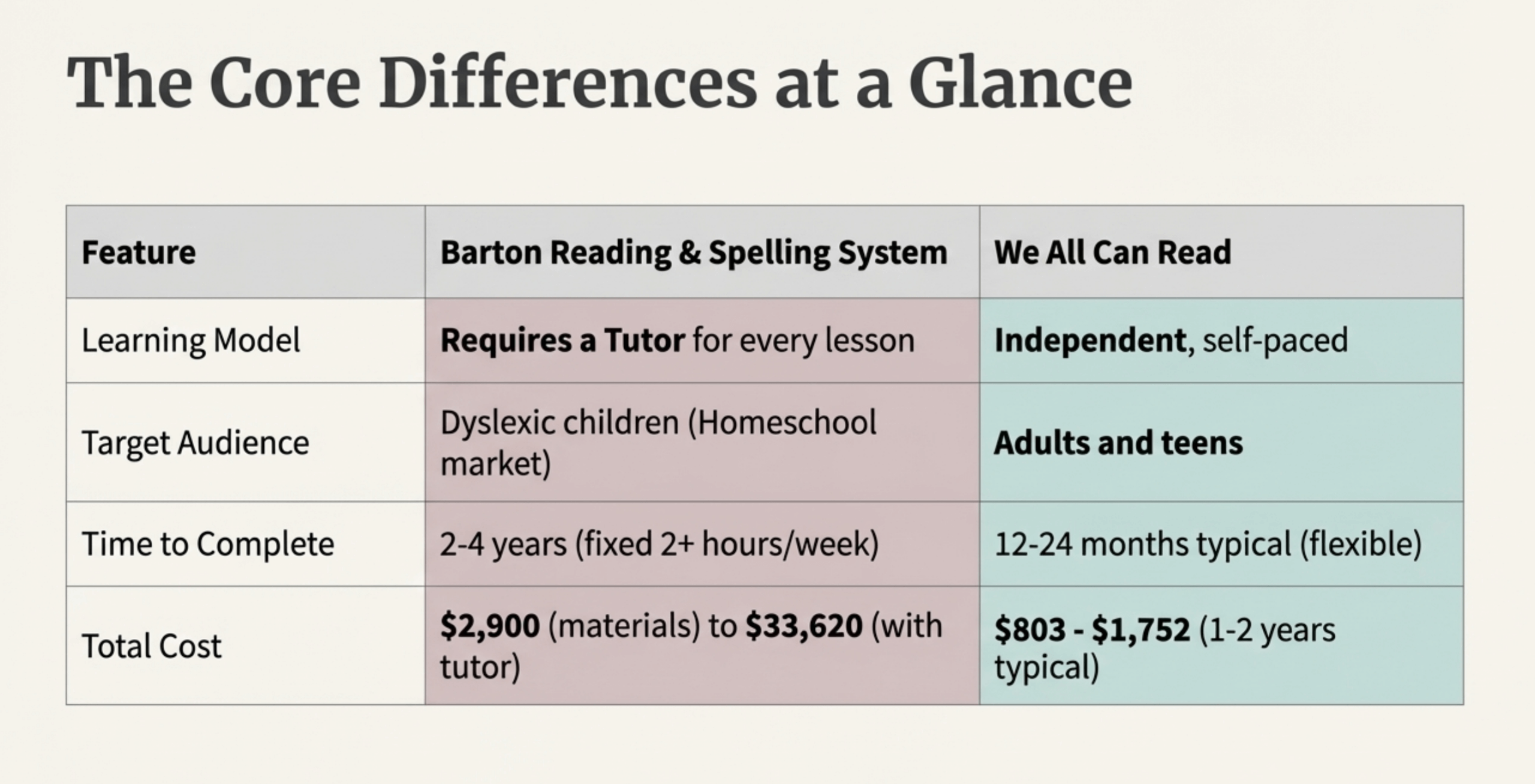 | Target Audience | Dyslexic children (homeschool market) | Adults and teens specifically |