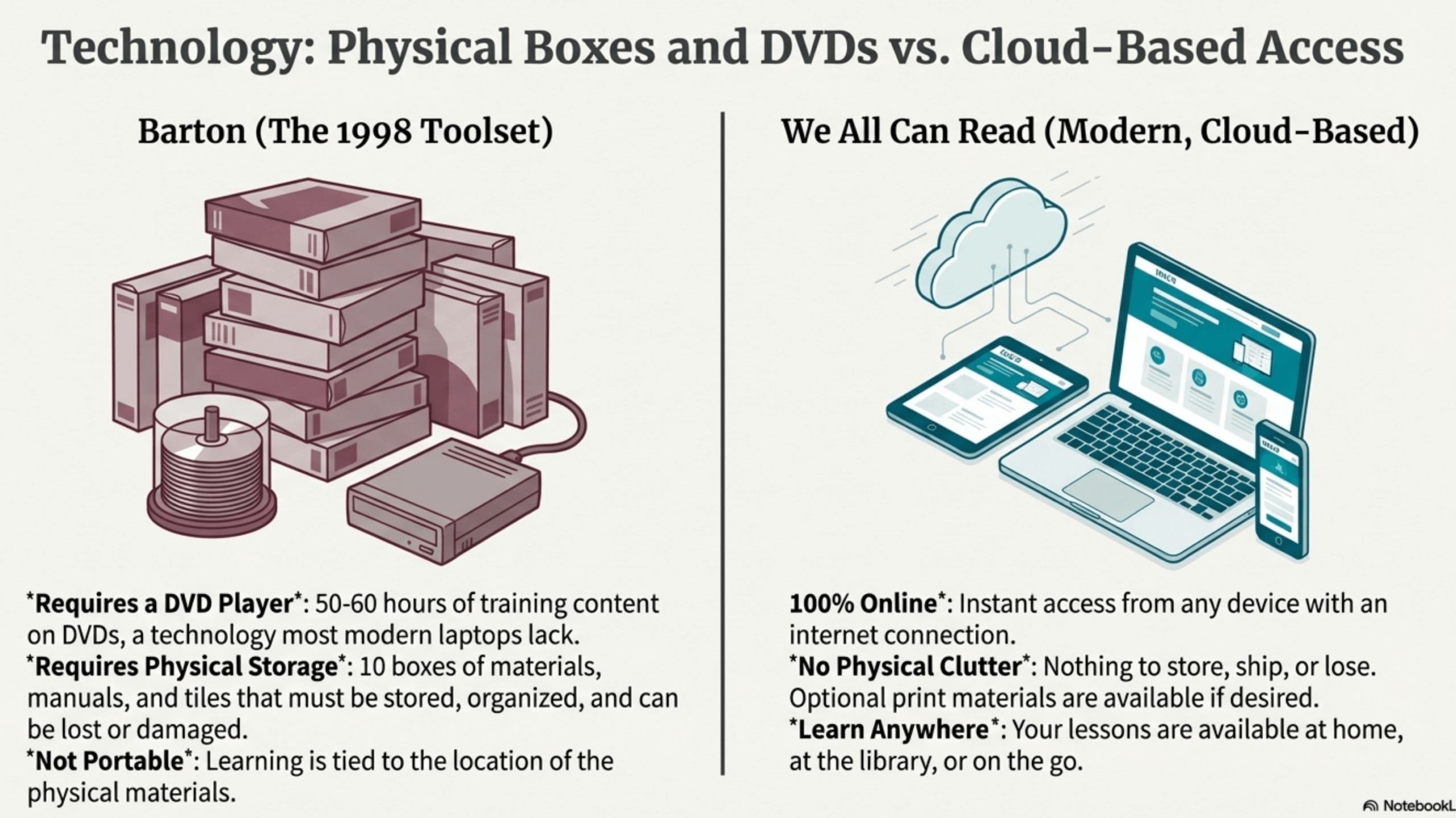 | Technology | DVD-based training, physical tiles/manuals | Cloud-based, any device (computer/tablet/phone) |