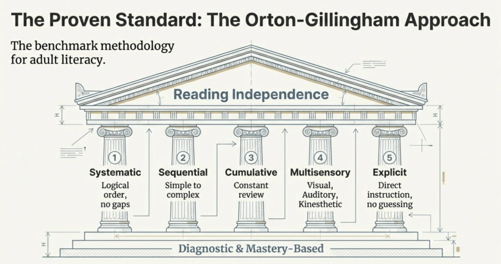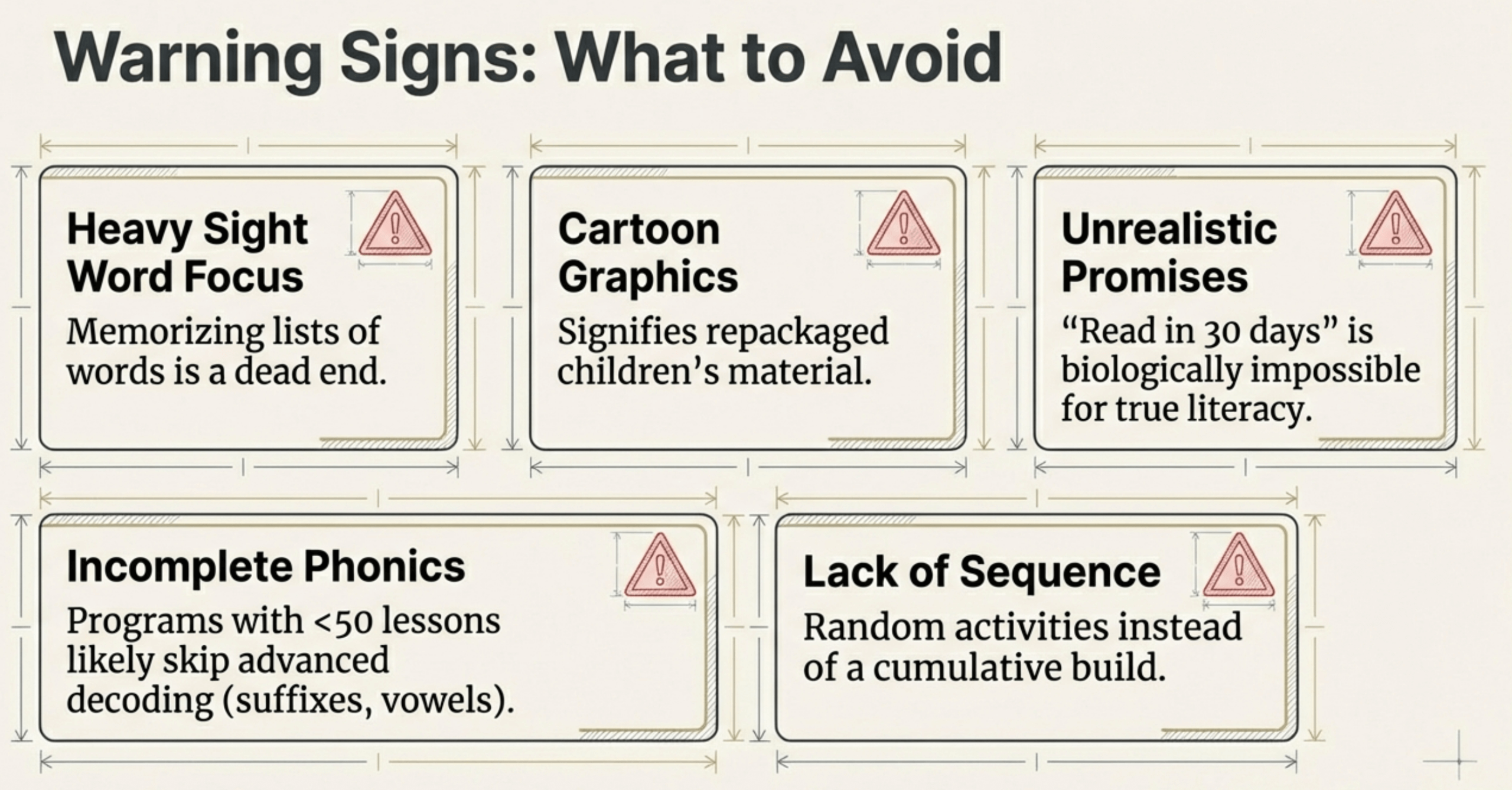 If a program relies primarily on memorization or context clues rather than teaching you the complete alphabetic code, it’s using methodology that has high failure rates with adults who struggle with reading.