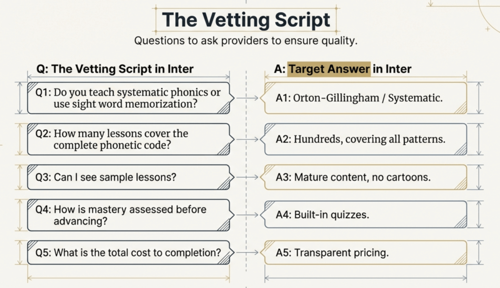 Ask specifically: “Do you teach the complete alphabetic code systematically from simple to complex?” Look for programs with several hundred lessons covering all phonetic patterns—not just basic phonics. Check if they follow Orton-Gillingham principles. If a program mentions “balanced approach” or emphasizes sight words heavily, it’s likely using mixed methods rather than true systematic phonics.