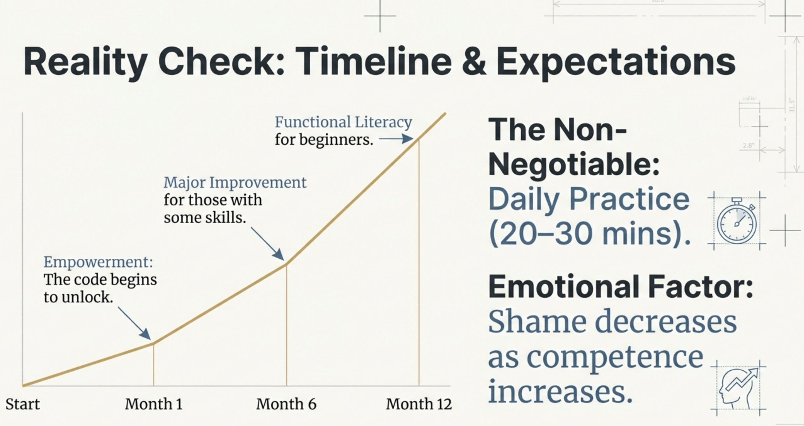 With consistent daily practice (20-30 minutes), most adults starting from the beginning achieve functional reading ability in 8-12 months. Adults who can read somewhat but struggle significantly typically see major improvement in 4-6 months. Be skeptical of programs promising dramatically faster results—learning to read requires genuine time and practice.