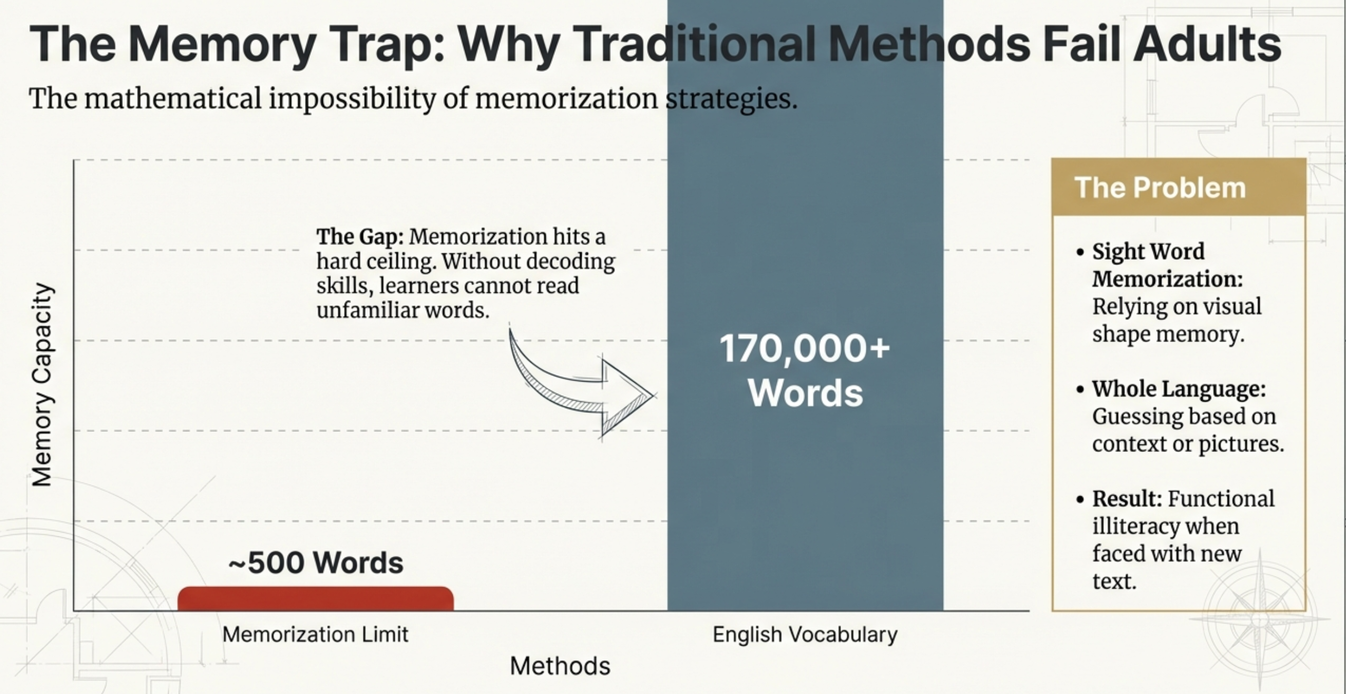 Sight word memorization. Many programs focus heavily on memorizing whole words by sight without teaching you how to decode them. You might memorize 100, 200, even 500 words—but English has over 170,000 commonly used words. Memorization has severe limits and leaves you unable to read unfamiliar words independently.