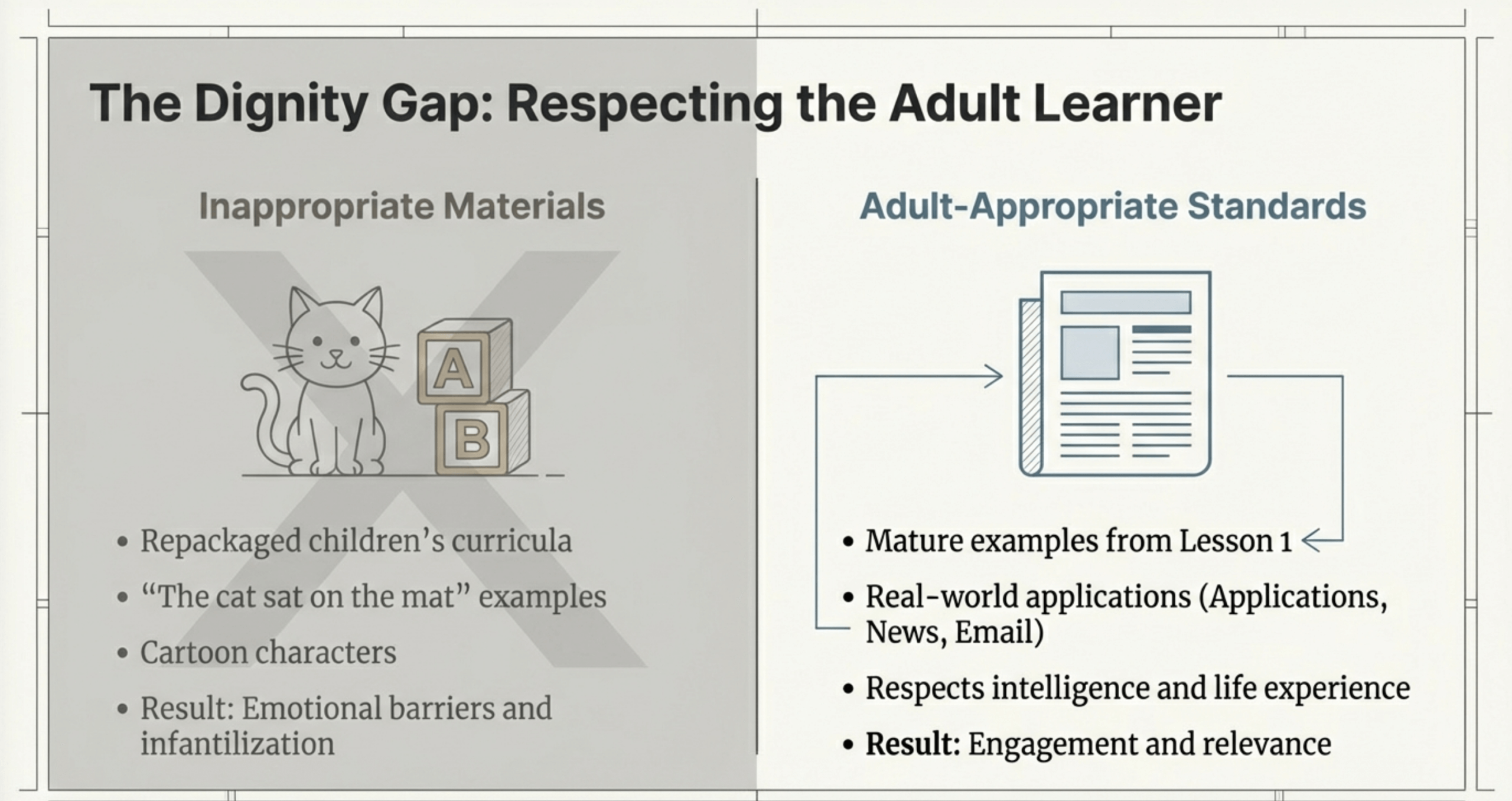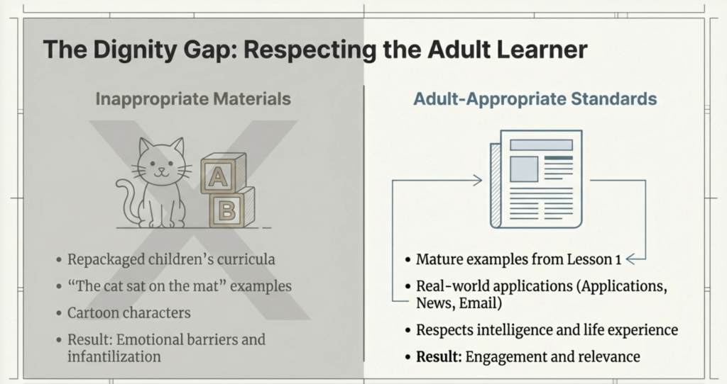 Many “adult” reading programs are simply children’s materials with a different cover. Reading passages about “The cat sat on the mat” or completing worksheets with cartoon characters feels infantilizing. This creates emotional barriers that interfere with learning.