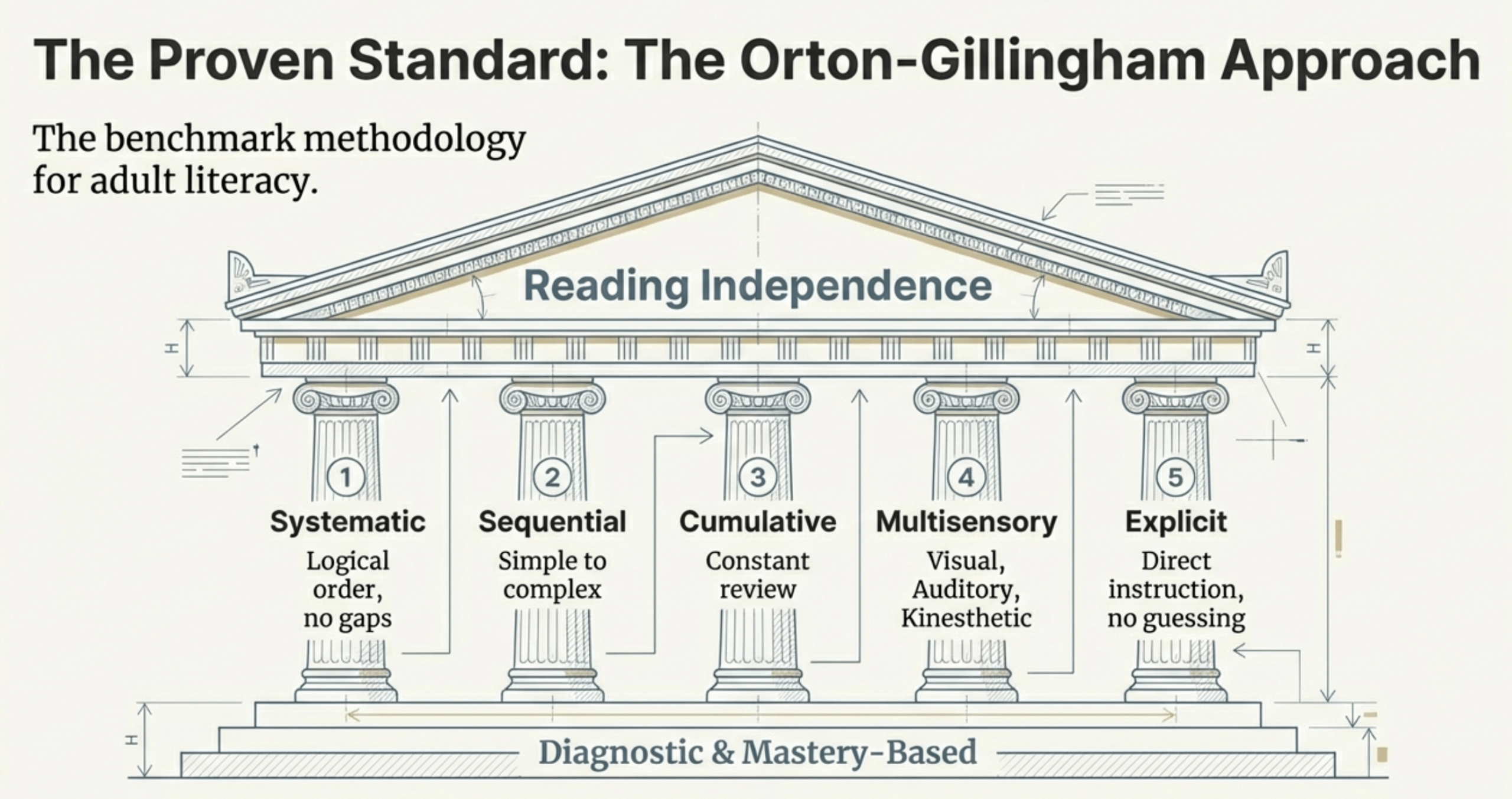 Programs following Orton-Gillingham principles have the strongest research support and highest success rates with adult learners.