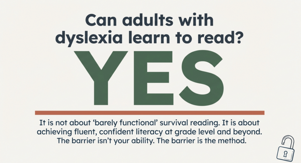 Adults with dyslexia can absolutely learn to read—and not just barely functional reading, but fluent, confident reading at grade level and beyond. While dyslexia makes learning to read more challenging than for neurotypical learners, proper instruction using proven methods overcomes these challenges at any age.