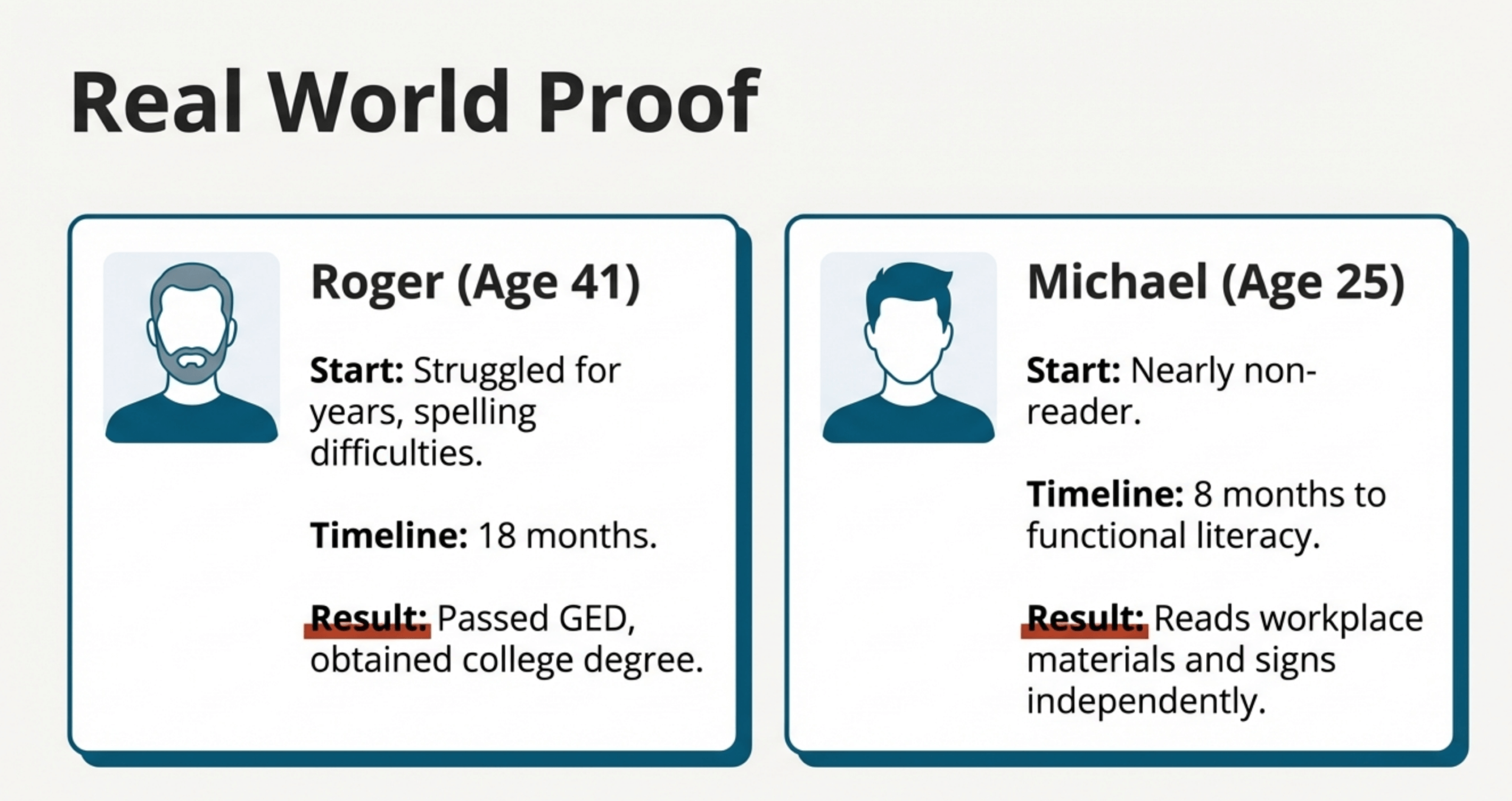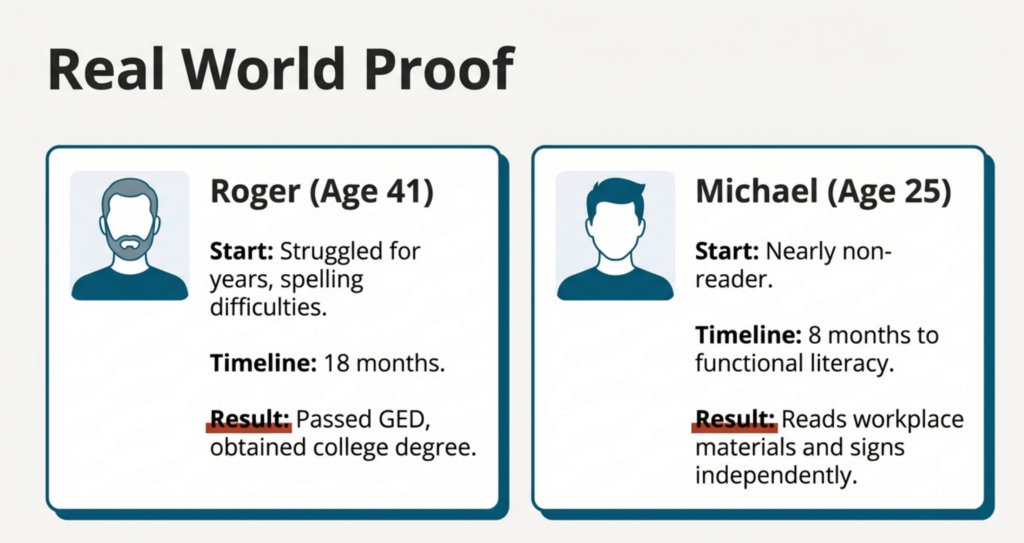 His journey from first passing the GED and then eventually receiving a college degree—demonstrate that even with probable dyslexia, adults can achieve grade-level reading proficiency with proper instruction.