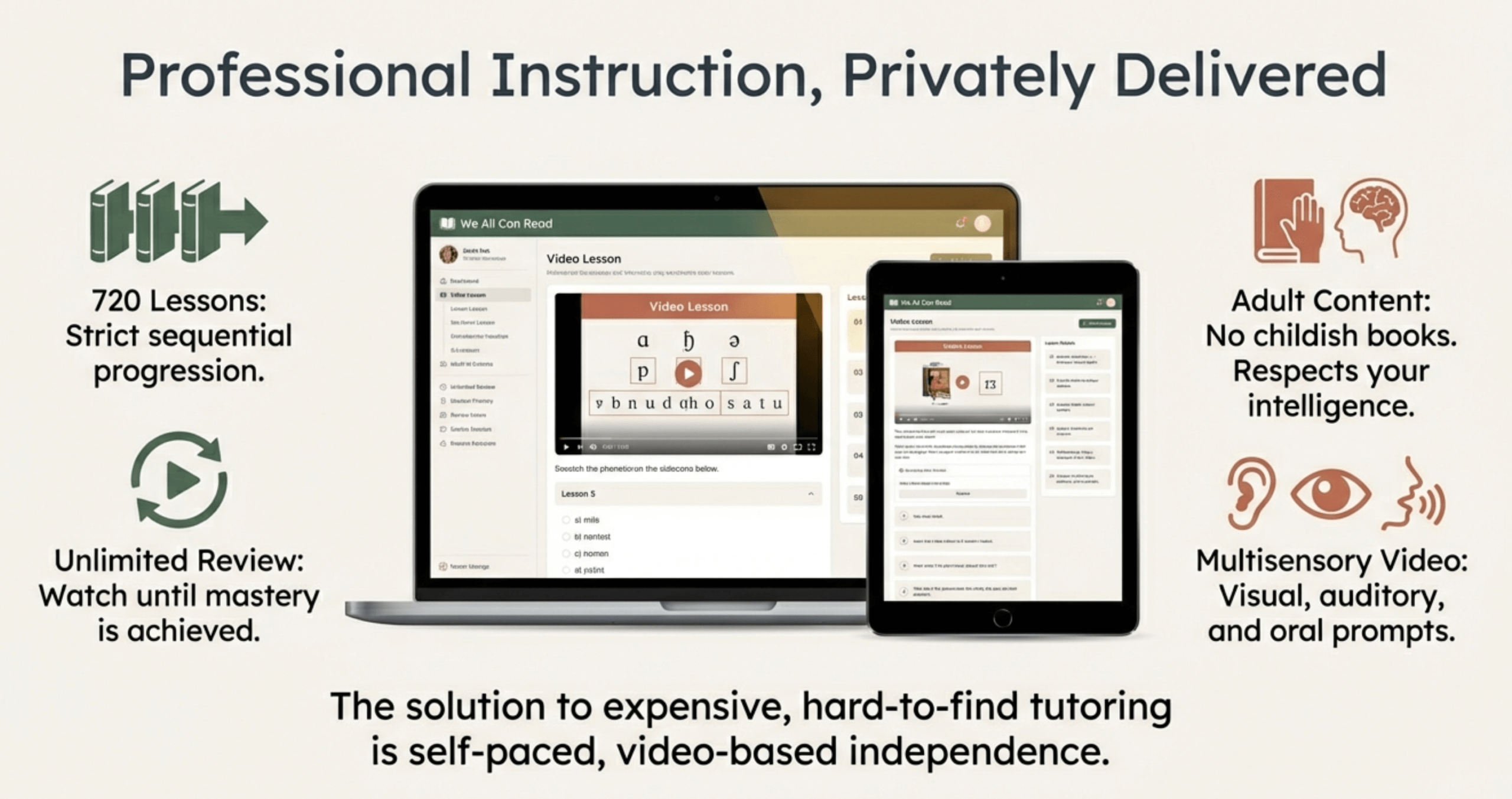 Traditional Orton-Gillingham tutoring requires one-on-one instruction with certified tutors—expensive ($60-$160/hour) and often unavailable in rural areas. Our adult phonics program adapts Orton-Gillingham principles for independent, self-paced video instruction.