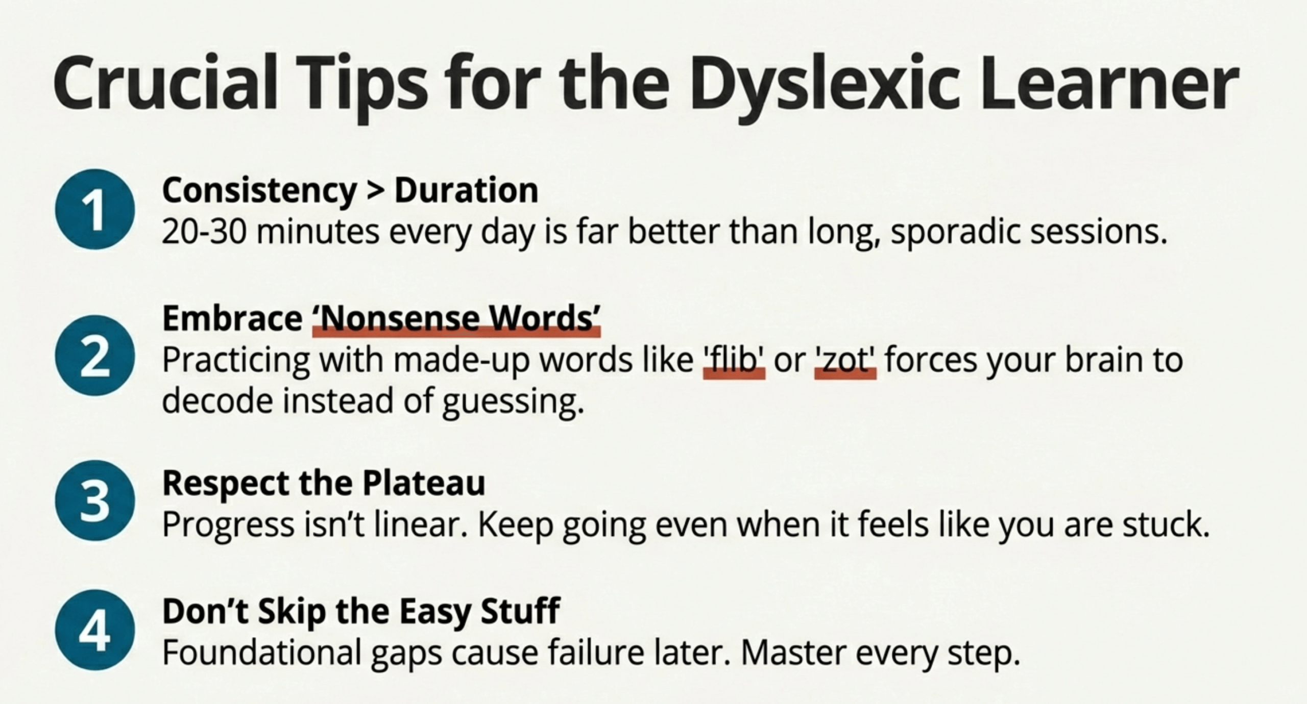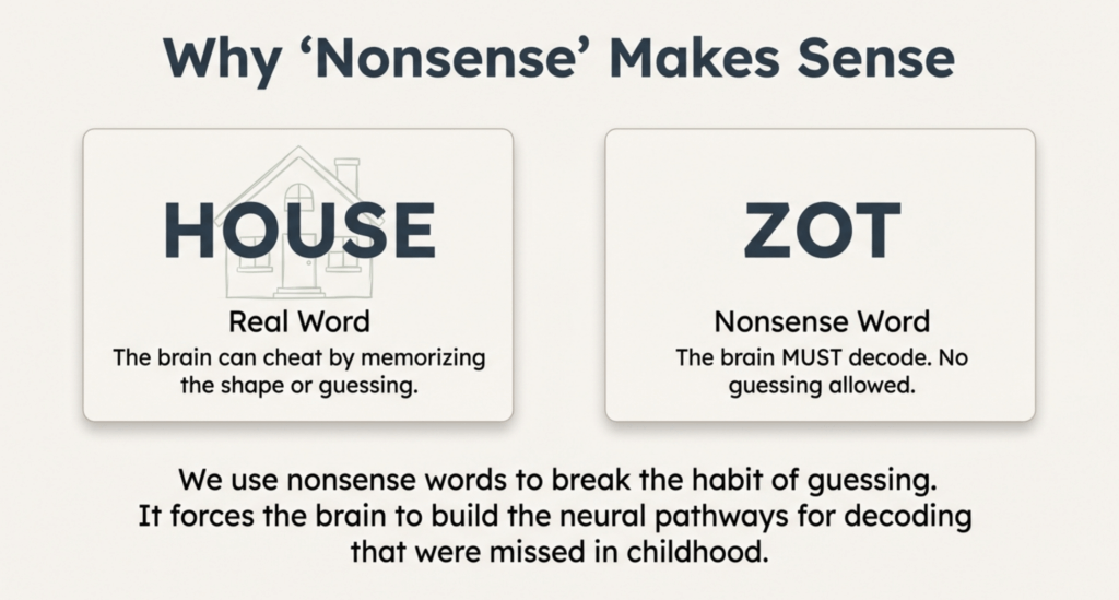 Nonsense word practice feels strange but is especially crucial for dyslexic learners. It forces your brain to use phonics rules rather than memory—exactly what dyslexic brains need to develop.