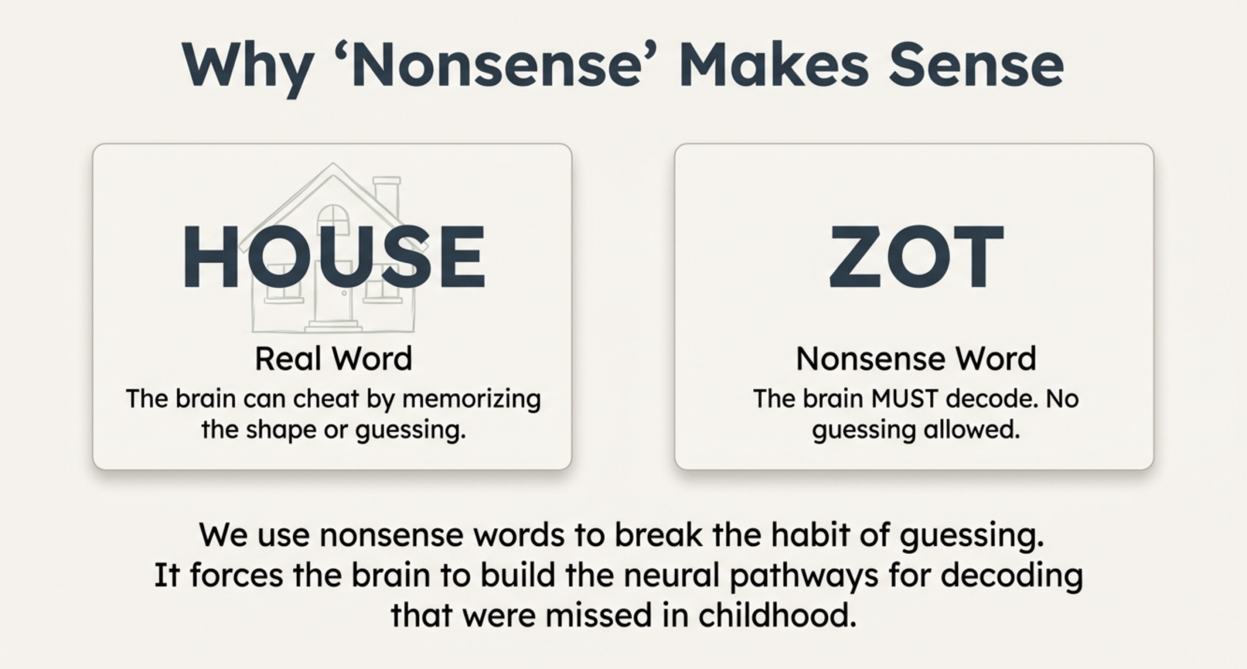 Our program makes extensive use of nonsense words—made-up words that follow phonics rules. This is especially important for dyslexic learners because: