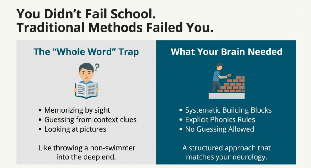 You’ve spent years believing you couldn’t learn to read. That belief was wrong—you simply never received instruction designed for dyslexic brains.