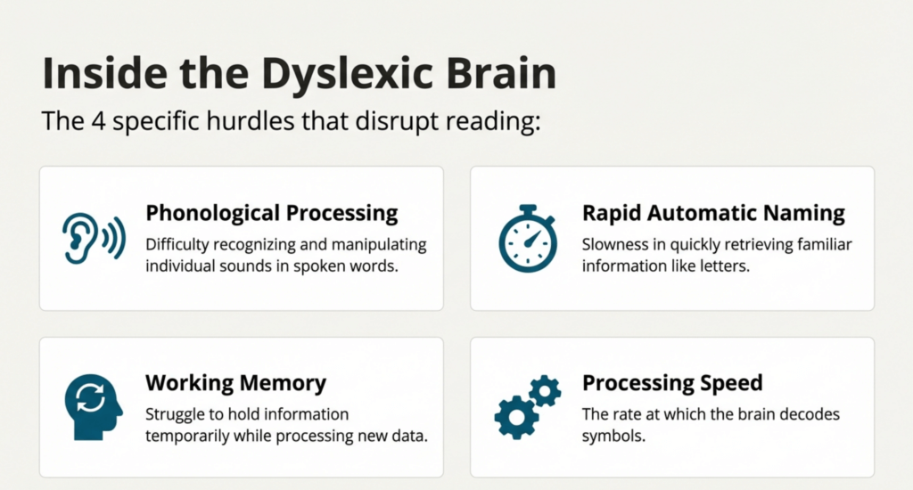Dyslexia is a neurological difference in how the brain processes written language. It’s not related to intelligence—many highly intelligent, successful people have dyslexia. The challenge stems from specific difficulties in: