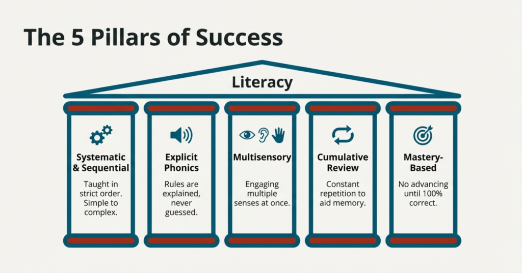 The key is using instruction specifically designed for how dyslexic brains process language. The Orton-Gillingham approach—developed specifically for dyslexic learners over 80 years ago—provides systematic, multisensory, explicit instruction that works with (not against) the dyslexic brain’s learning style.
