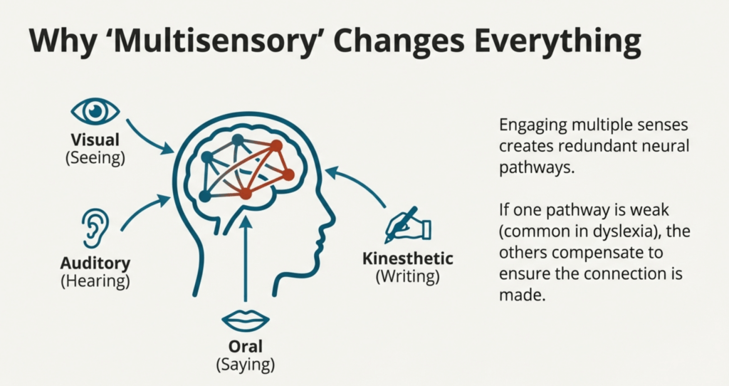 Why this helps dyslexic learners: Multiple sensory inputs create redundant pathways in the brain. If one pathway is weaker (common in dyslexia), others compensate.
