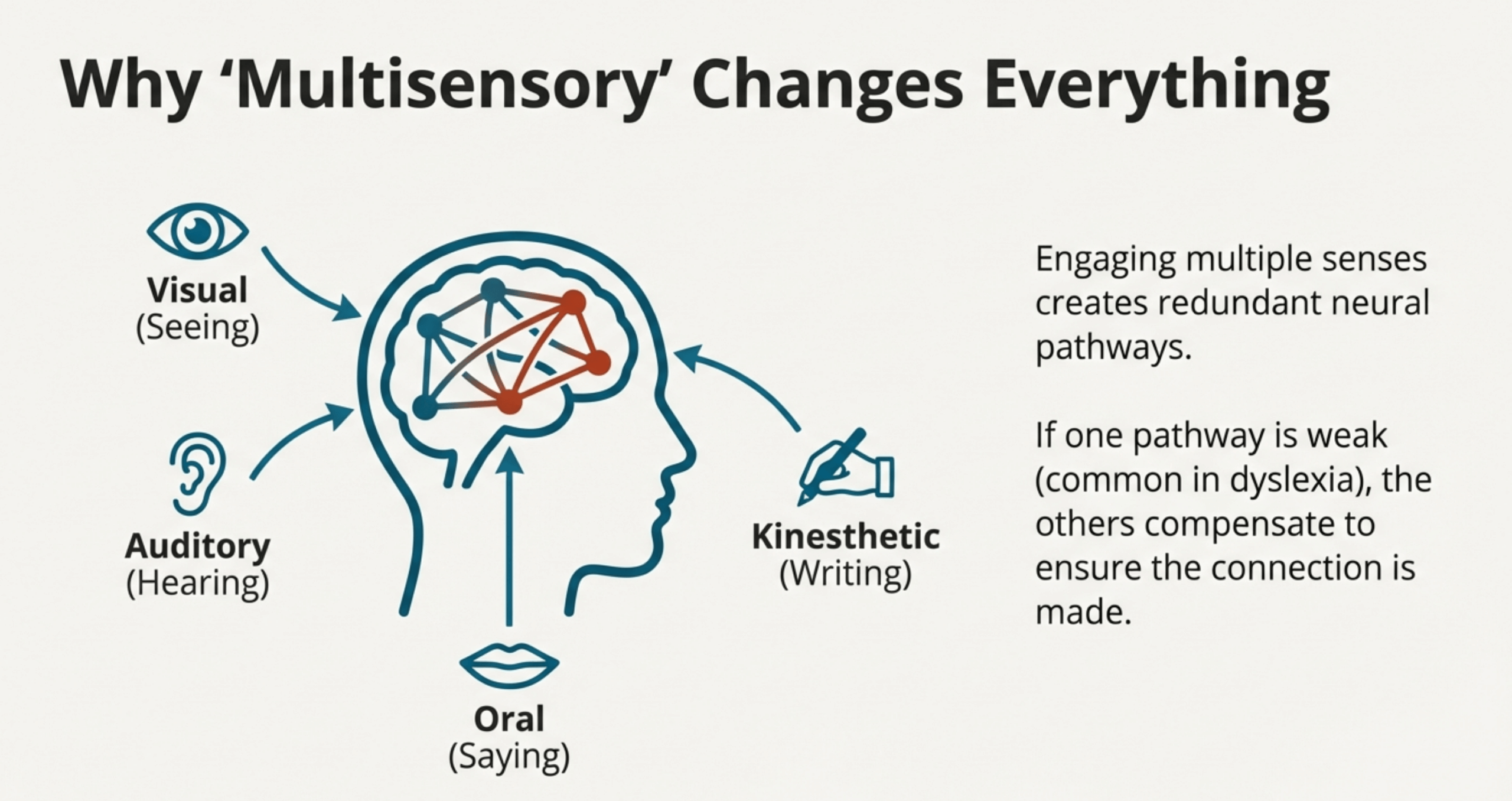 This multisensory approach is crucial for dyslexic brains.