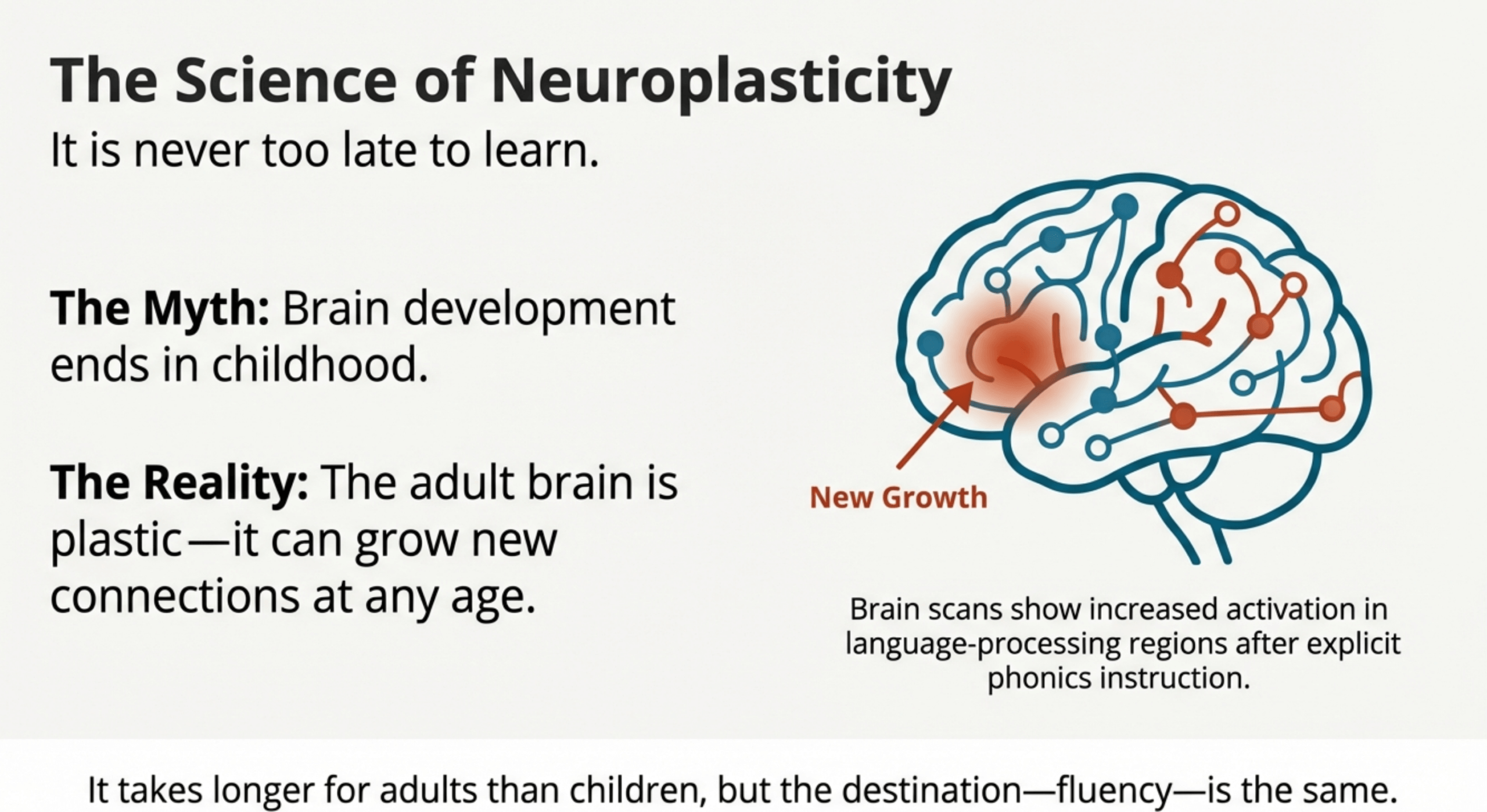 - Adult brains remain capable of developing reading skills at any age