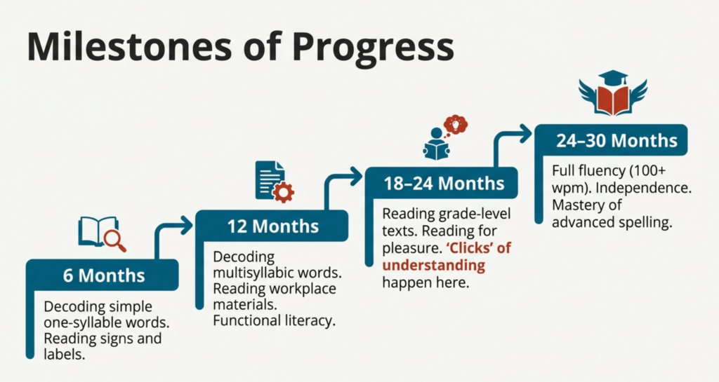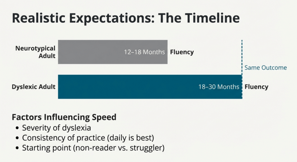 Dyslexic adults typically need 18-30 months to achieve fluent, confident reading with consistent daily practice (30-60 minutes). This is longer than the 12-18 months typical for non-dyslexic adults, but absolutely achievable.