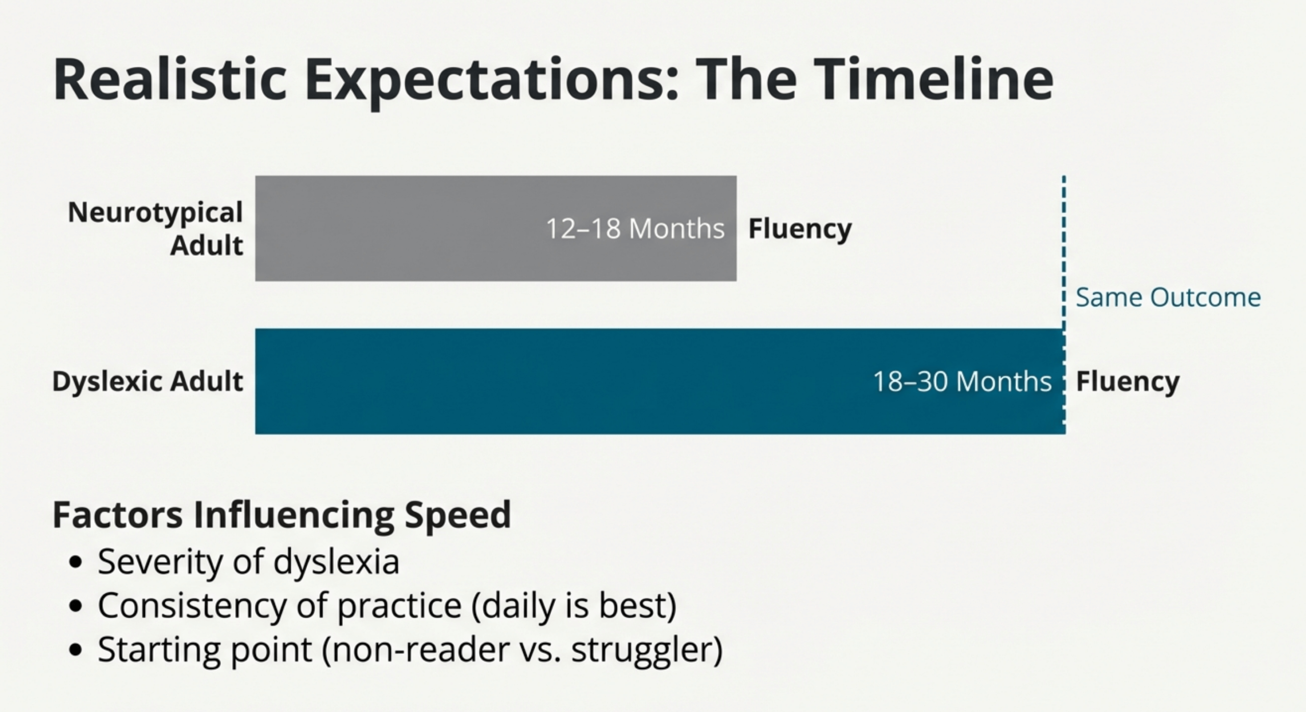- Longer timelines: 18-30 months vs. 12-18 months for non-dyslexic learners