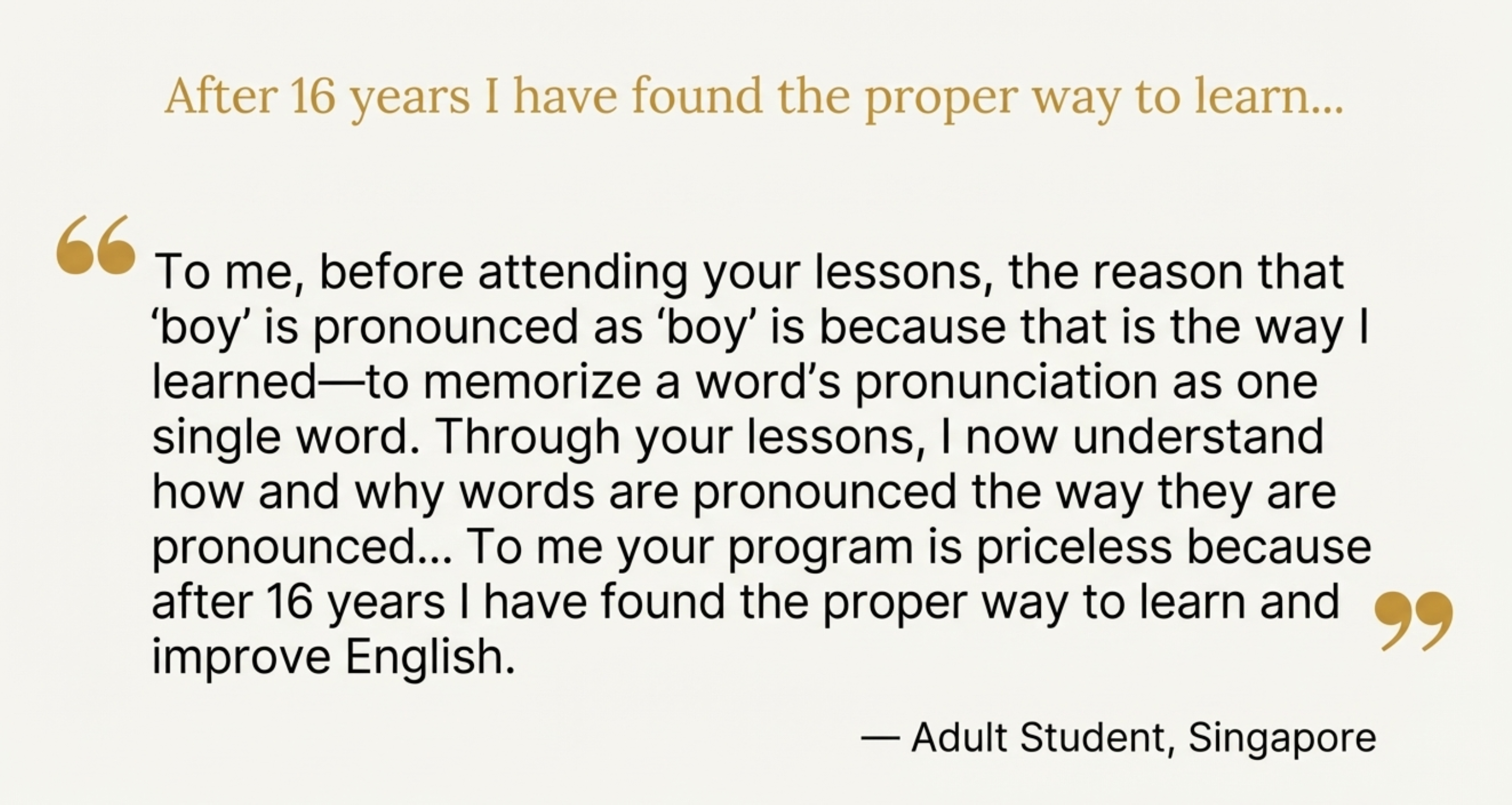To me, before attending your lessons, the reason that ‘boy’ is pronounced as ‘boy’ is because that is the way I learned—to memorize a word’s pronunciation as one single word. Through your lessons, I now understand how and why words are pronounced the way they are pronounced.