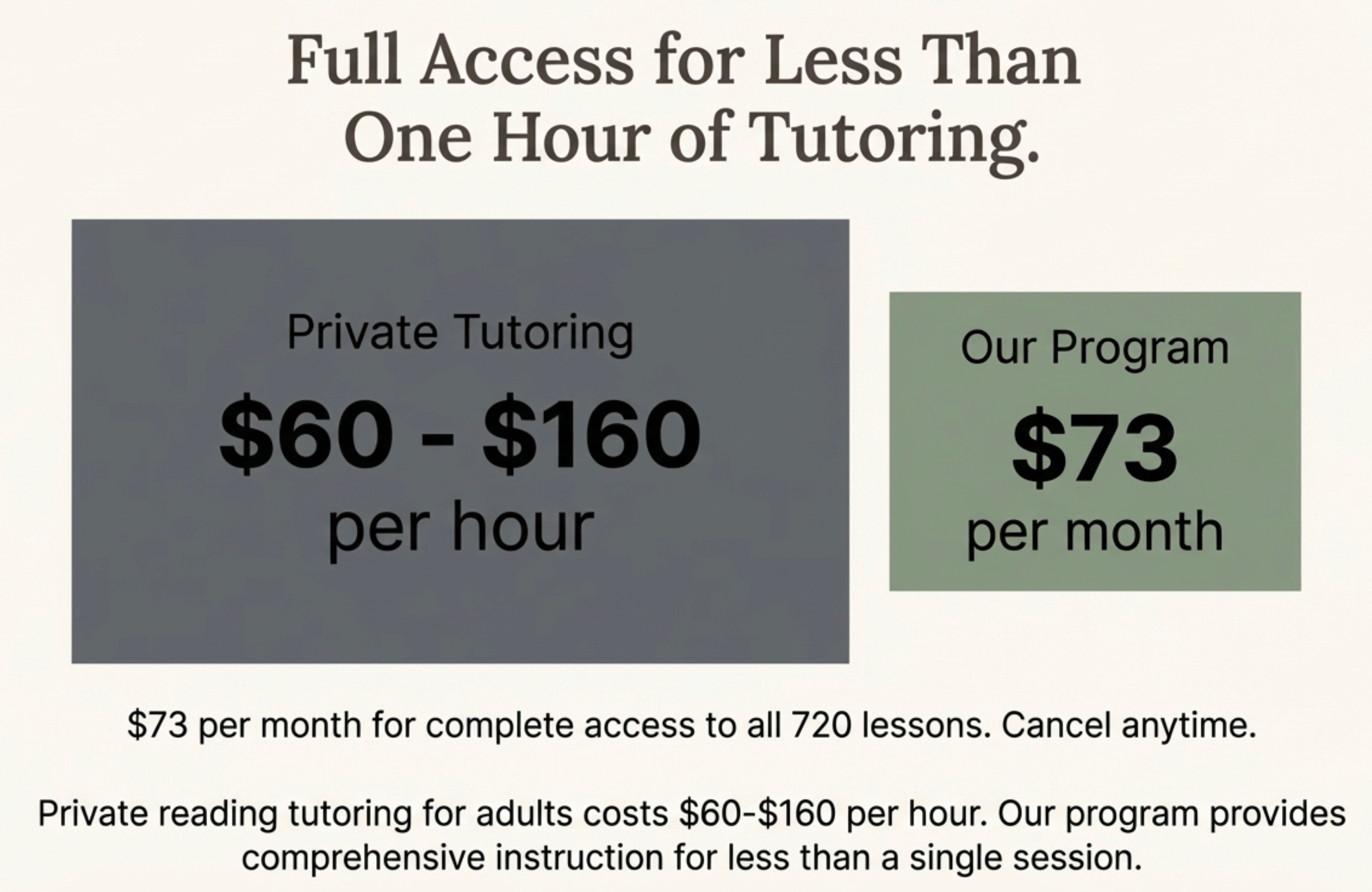 Private reading tutoring for adults costs $60-$160 per hour. Our program provides comprehensive instruction for $73 per month—less than the cost of a single tutoring session. You can build the reading skills you need without financial burden.