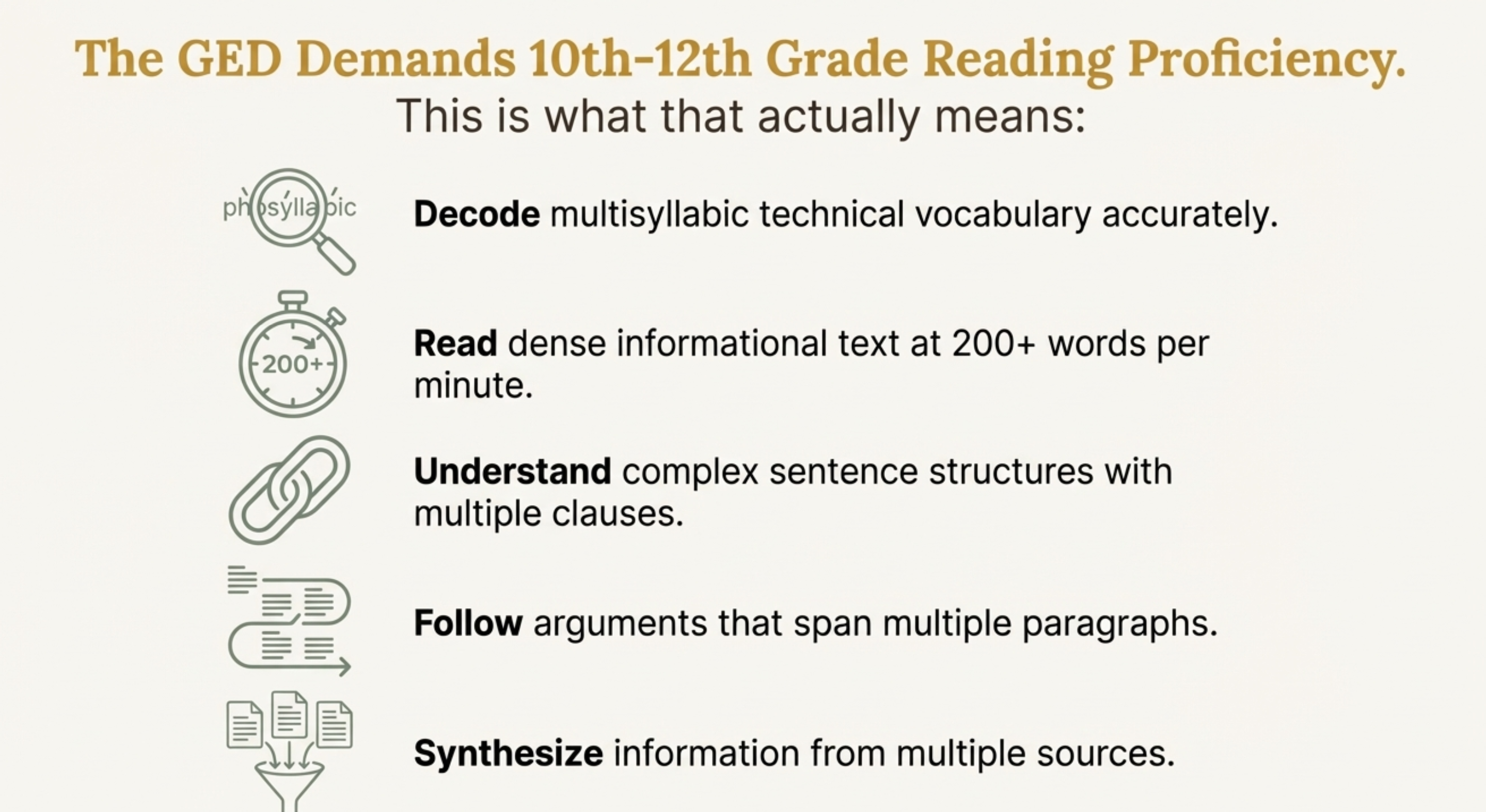Reading works the same way. You need systematic instruction in phonics, decoding, fluency, and comprehension strategies. Once you build these skills, the GED content becomes accessible.