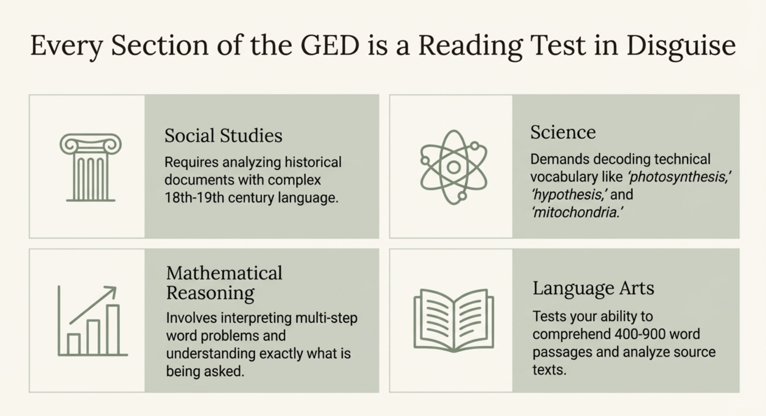 Every section of the GED is fundamentally a reading test. Understanding these demands helps clarify why strong reading skills are essential.