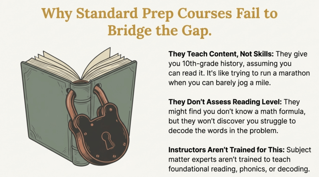 GED preparation courses don’t assess your reading level. They don’t build reading skills. They assume you can already read the materials they provide. When students struggle, programs blame insufficient study time or lack of focus—never inadequate reading skills.