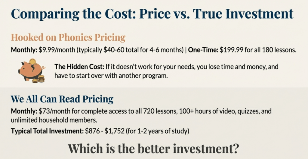 The real question isn’t which program costs less—it’s which methodology actually works for adults who struggle with reading. For a detailed comparison of adult phonics programs including cost, methodology, and effectiveness, see our Adult Phonics Cost Comparison Guide.
