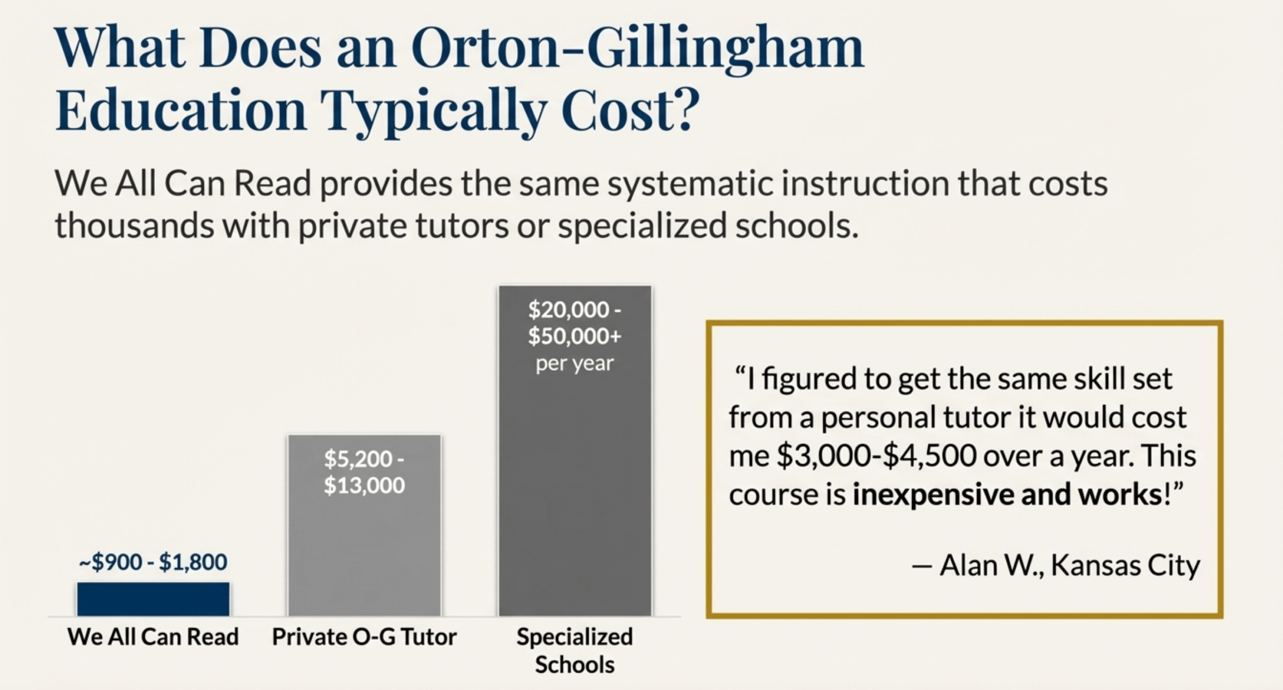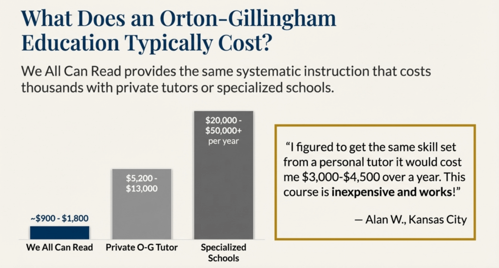 The value: For under $900, you get the same systematic Orton-Gillingham instruction that costs thousands with tutors or specialized schools.