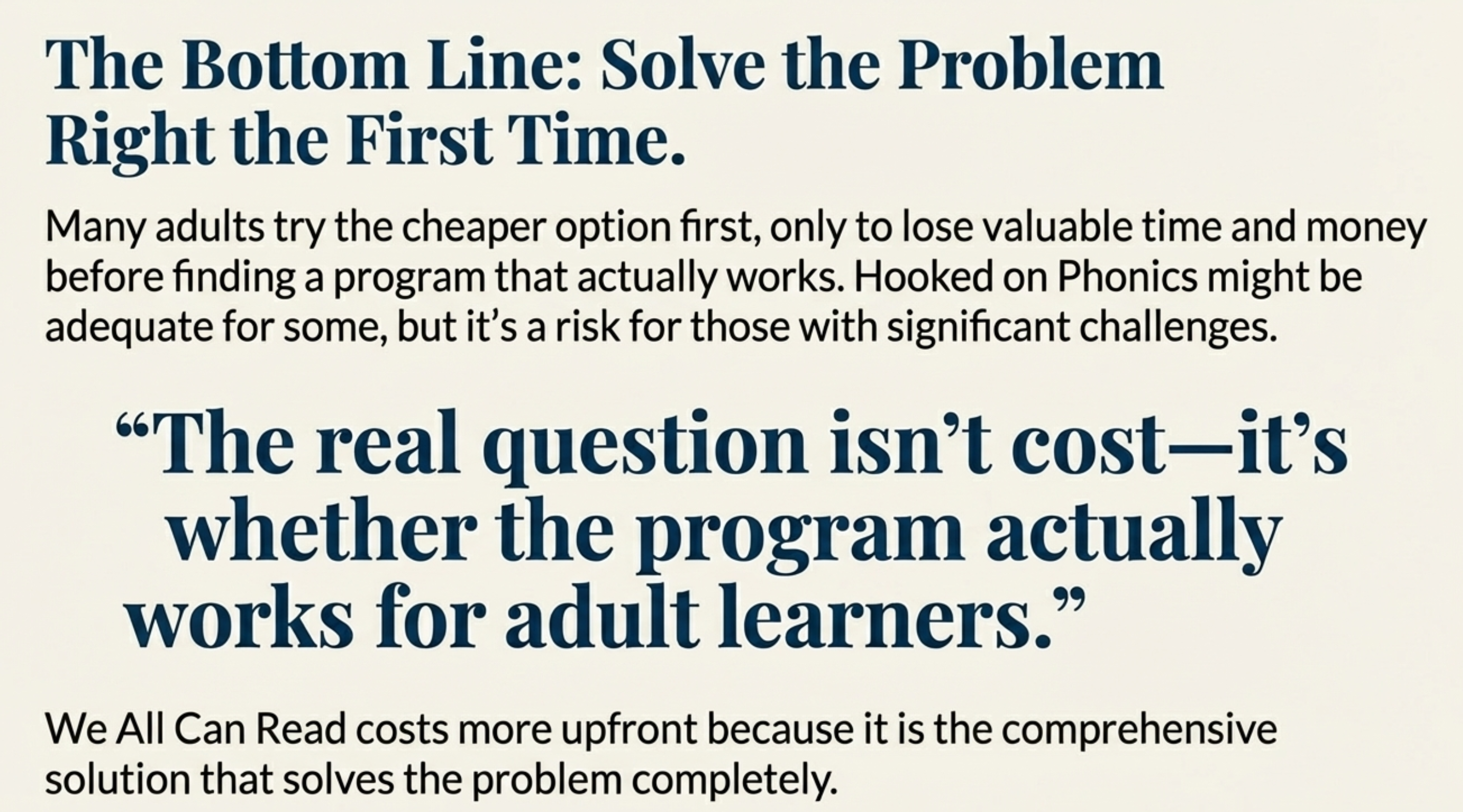 Many adults try Hooked on Phonics first because it’s cheaper, then end up spending more money (and losing valuable time) finding a program that actually addresses their needs.