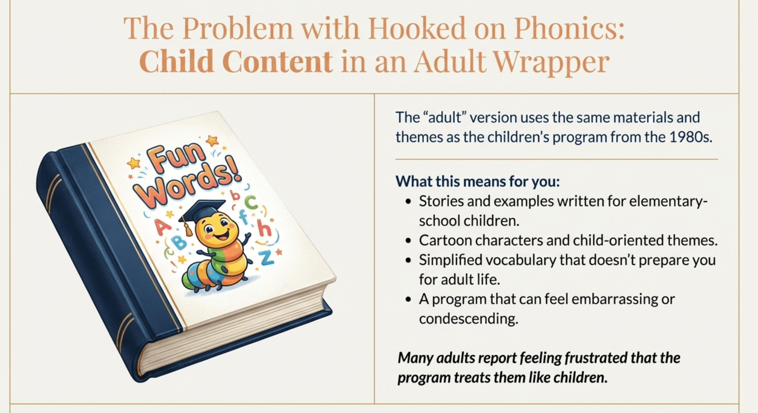 Hidden cost: If Hooked on Phonics doesn’t work (common for adults with significant reading difficulties), you’ll need to find another program—spending more money and losing time.