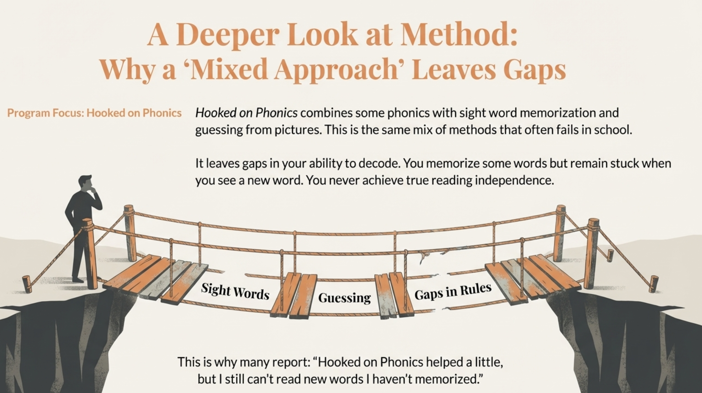 This is why many adults report: “Hooked on Phonics helped a little, but I still can’t read new words I haven’t memorized.”