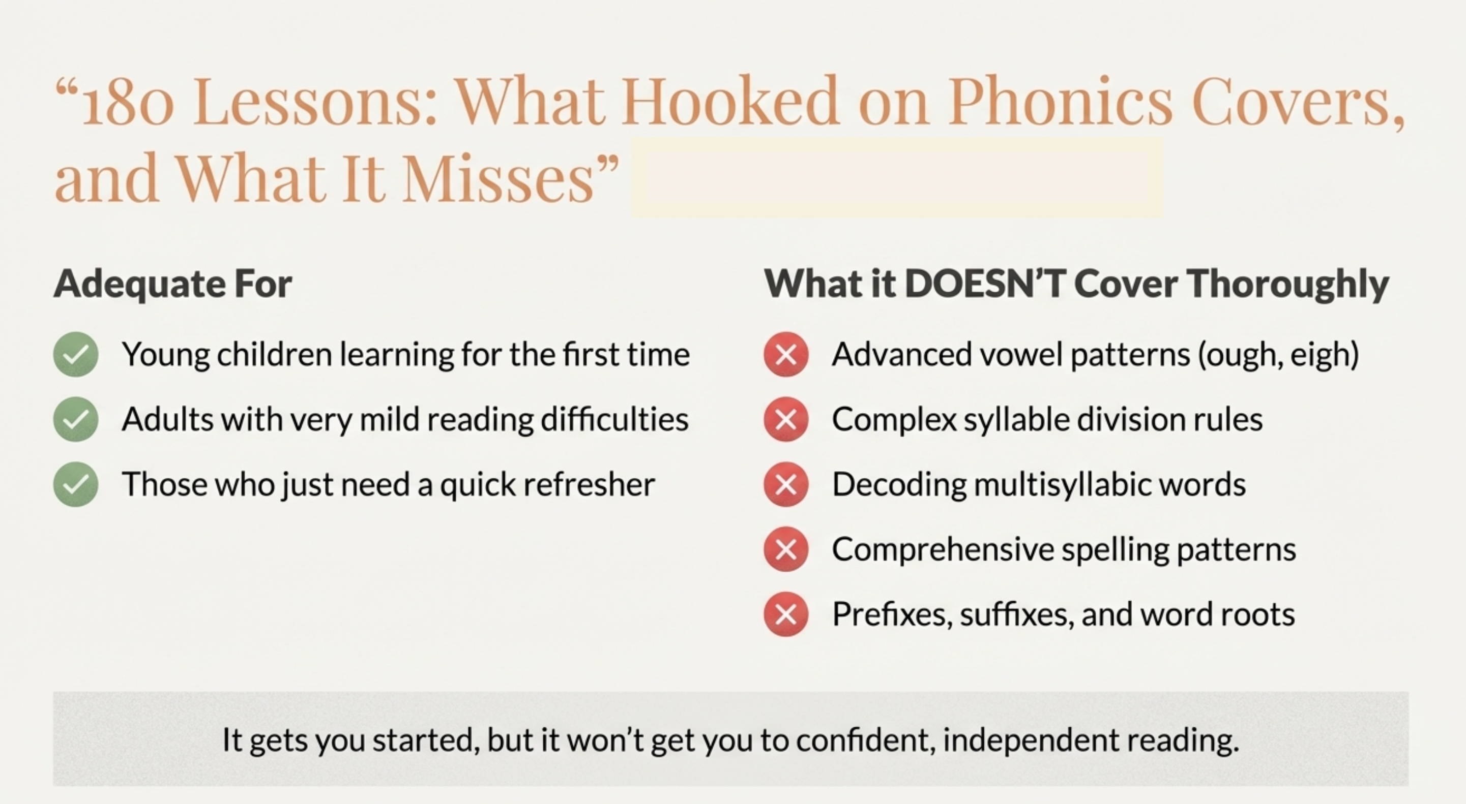 Bottom line: Hooked on Phonics gets you started but leaves significant gaps in your phonics knowledge.