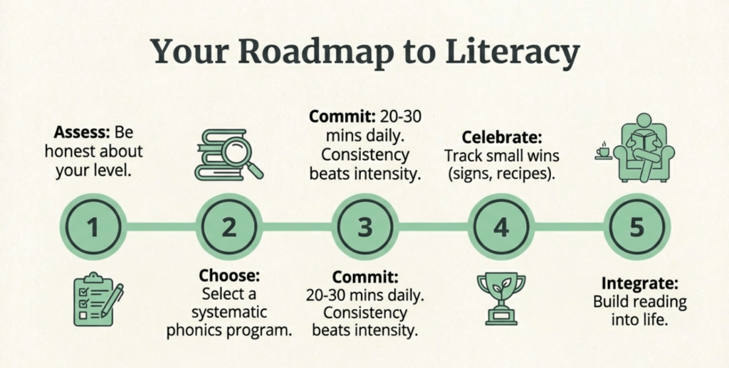 If you’re ready to learn to read, here’s a realistic roadmap: