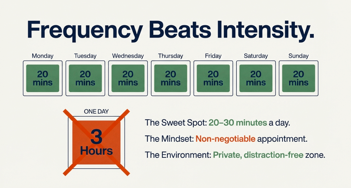 Consistency matters more than intensity. Daily practice of 20-30 minutes works better than occasional marathon sessions.