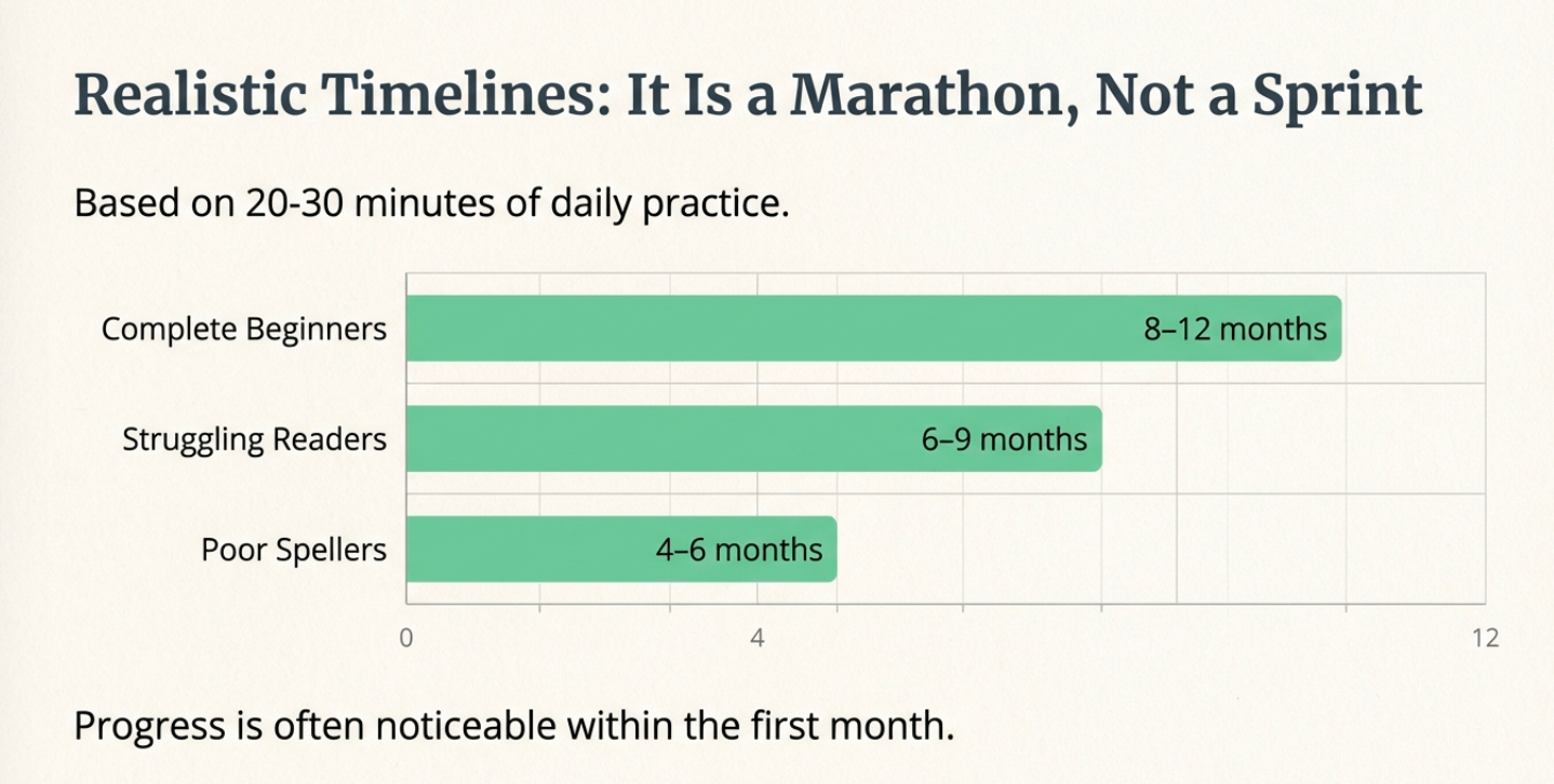 For a detailed breakdown of learning timelines and what to expect at each stage, see How Long Does It Take Adults to Learn Phonics?