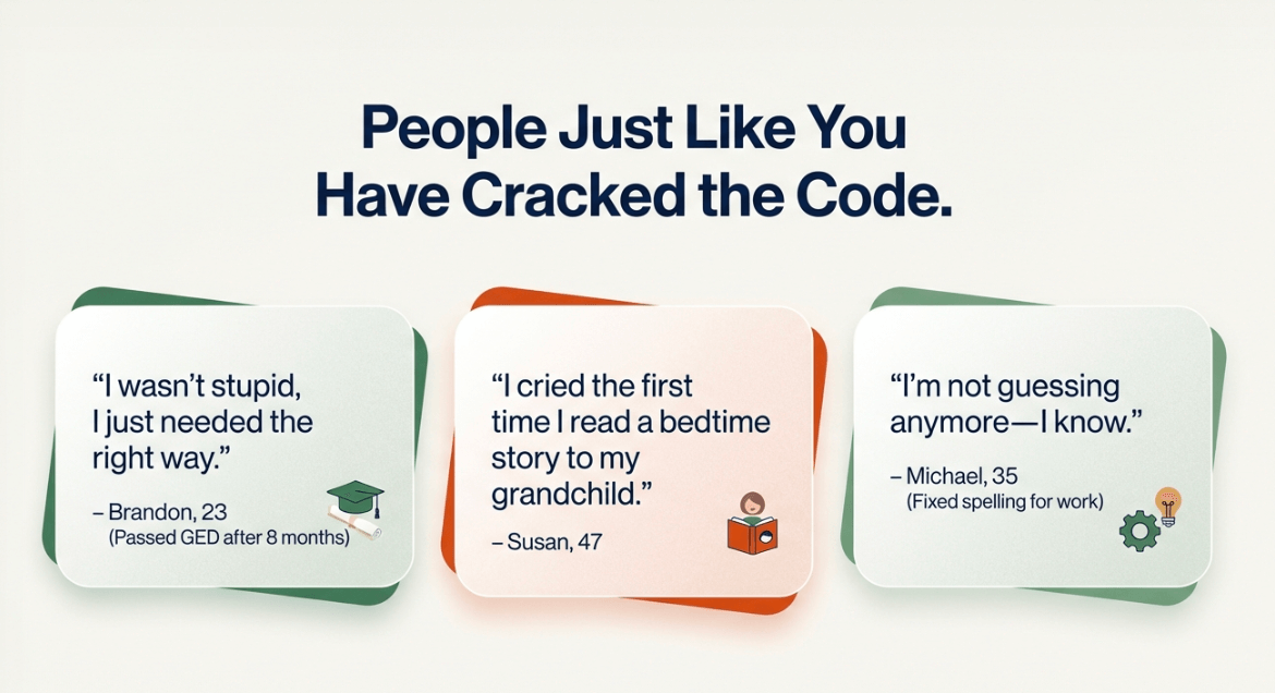Here’s what you need to know: adults can absolutely learn to read, regardless of age. The reason you struggle isn’t because you lack intelligence or ability. You struggle because you were never properly taught the foundational code that underlies written English. And that code can be learned at any age.
