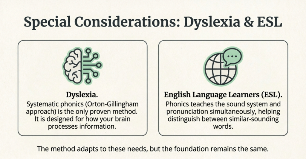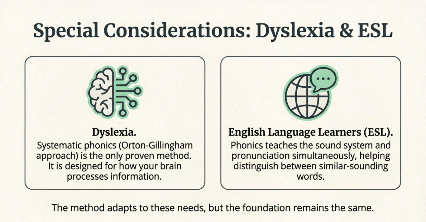If you have dyslexia or suspect you might, systematic phonics instruction is especially important. Research consistently shows that people with dyslexia learn to read most effectively through structured, multisensory phonics instruction following the Orton-Gillingham approach.