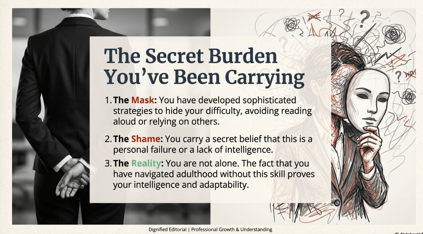 If you’re an adult who struggles with reading, you’re carrying a secret that millions of others share. You’ve developed sophisticated strategies to hide your reading difficulties. You avoid situations that require reading aloud. You feel shame about something that wasn’t your fault.